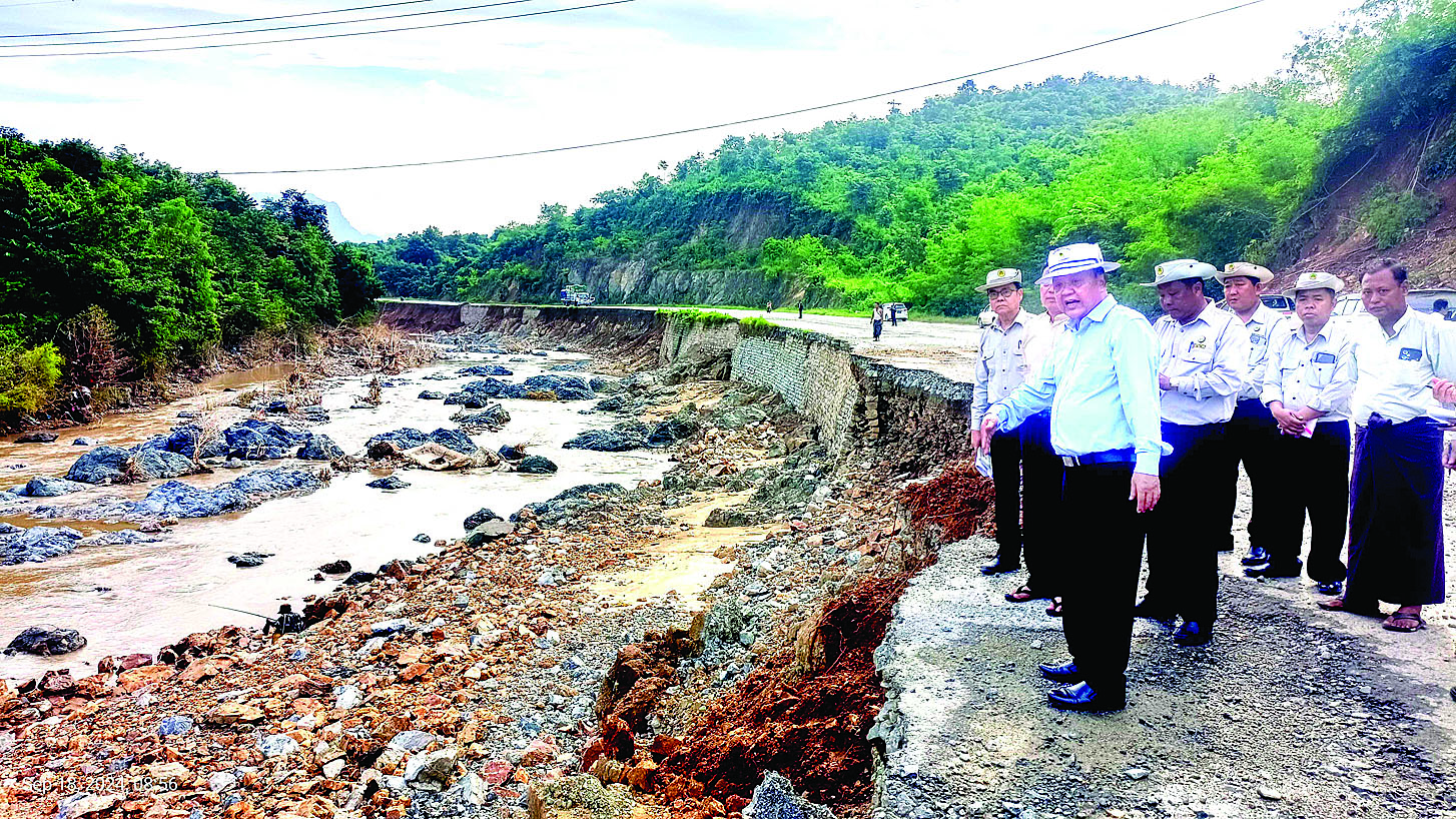 ထို့နောက် မိတ္ထီလာ - တောင်ကြီး လမ်းပိုင်းဖြစ်သည့် မိုင်တိုင်အမှတ် (၄၀/၀-၄၀/၃) ကတ္တရာလမ်းသား ပဲ့ကျနေမှုကိုလည်းကောင်း၊ မိုင်တိုင်အမှတ် (၄၅/၃- ၄၅/၄) ကြား ရေကျော်သဖြင့် လမ်းပေါ်တွင် တင်ကျန်နေသည့် ရွှံ့နုန်းမြေများ စက်၊ ယာဉ်၊ ယန္တရားများဖြင့် ဖယ်ရှားနေမှုနှင့် မိုင်တိုင်အမှတ် (၄၇/၁-၄၇/၃) ကြား မြစ်ဆုံကွေ့တွင် ရေတိုက်စားပြီး အကျယ် ၁၄ ပေ၊ အလျားပေ ၃၀၀၊ လမ်းတာပေါင်နှင့် ကတ္တရာလမ်းသားပဲ့ကျနေမှုကိုလည်းကောင်း ကြည့်ရှုစစ်ဆေးပြီး မိတ္ထီလာ - တောင်ကြီး လမ်းပိုင်းဘေးရှိ ချောင်းအတွင်း ကျောက်နံရံစီမြေဖို့ပြီး ကျူးကျော်ထားခြင်းကြောင့် ချောင်းရေစီးကြောင်း ထိခိုက်နိုင်သဖြင့် သက်ဆိုင်ရာဌာနများနှင့်ပေါင်းစပ်ပြီး ကျူးကျော်များကို ဖယ်ရှားရှင်းလင်းရန်နှင့် လိုအပ်သည်များကို မှာကြားသည်။