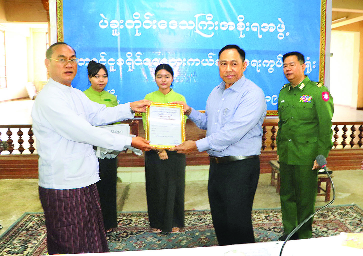 ယင်းနောက် တောင်ငူခရိုင် ရေဘေးကွပ်ကဲမှုရုံးသို့ ဧရာဝတီဖောင်ဒေးရှင်းက လာရောက်လှူဒါန်းသည့် ဆန်အိတ် ၁၀၀၀ နှင့် ပွင့်ထူးစံကုမ္ပဏီကလှူဒါန်းသည့် ငွေကျပ်သိန်း ၅၀၀ ကို ပြည်ထောင်စုဝန်ကြီးက လည်းကောင်း၊ ဦးစိုင်းမွန်(မုန်းဝင်းမြန်မာ)မိသားစုက လှူဒါန်းသည့် အလှူငွေကျပ်သိန်း ၁၀၀ ကို တိုင်းဒေသကြီးဝန်ကြီးချုပ်က လည်းကောင်း၊ ပဲခူးနှင့် သနပ်ပင်မြို့နယ်ရှိ လုပ်ငန်းရှင်များက လှူဒါန်းသည့် အလှူငွေကျပ်သိန်း ၇၀ ကို တိုင်းမှူးကလည်းကောင်း လက်ခံရယူခဲ့ကြပြီး ဂုဏ်ပြုမှတ်တမ်းလွှာများ ပြန်လည်ပေးအပ်သည်။