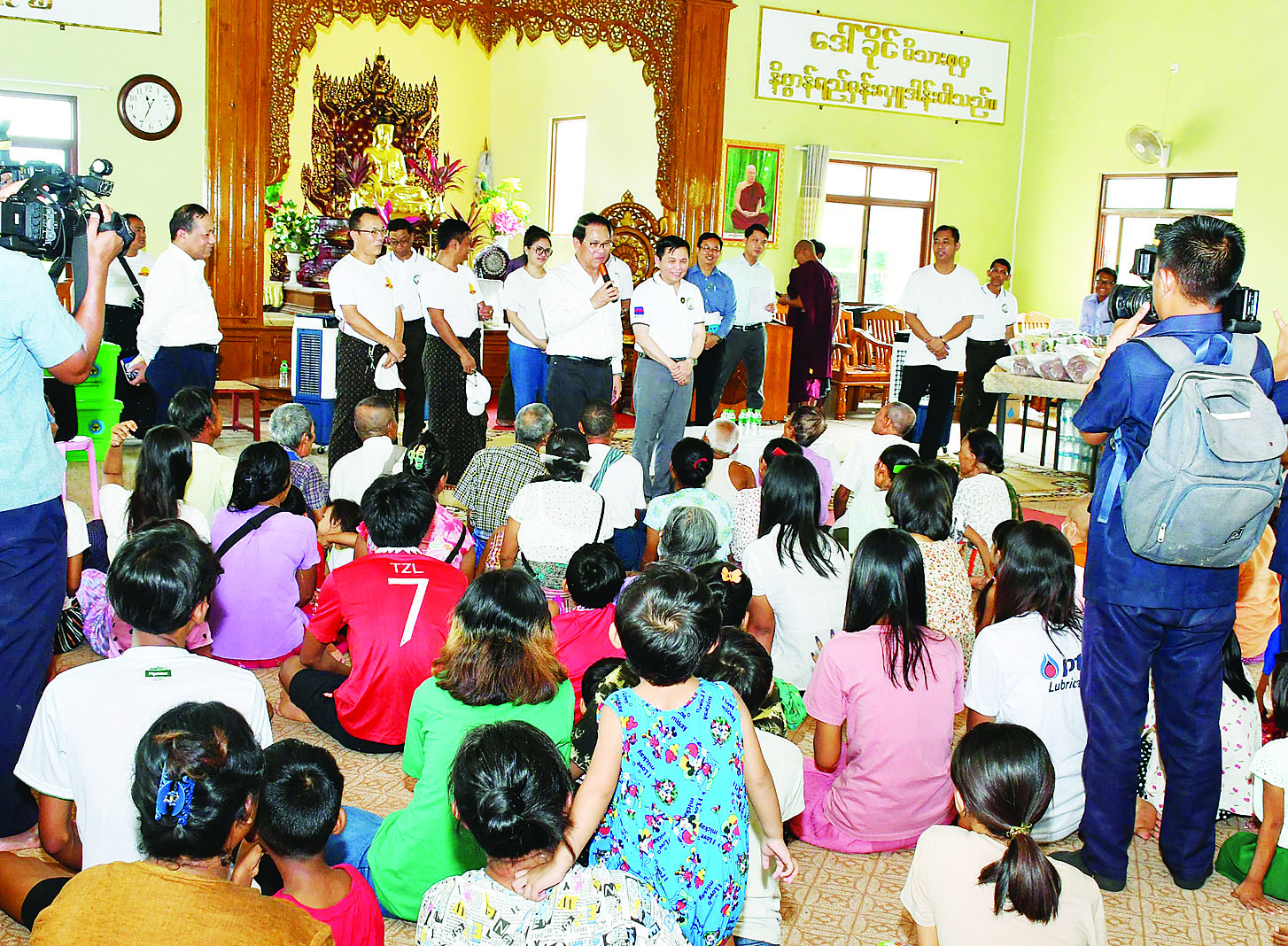 ထို့နောက် အဆိုပါကျောင်းတိုက်ရှိ ဓမ္မာရုံ၌ ရေဘေးသင့်ပြည်သူများအား ရင်းရင်းနှီးနှီး တွေ့ဆုံနှုတ်ဆက်ပြီး ပြည်ထောင်စုဝန်ကြီးများနှင့်အတူ အနုပညာရှင်များက လှူဒါန်းရခြင်းအကြောင်း ရှင်းလင်းပြောကြား၍ အားပေးစကားများ ပြောကြားကြကာ ရေဘေးသင့်ပြည်သူများအား ရင်းရင်းနှီးနှီး တွေ့ဆုံနှုတ်ဆက်ကြသည်။