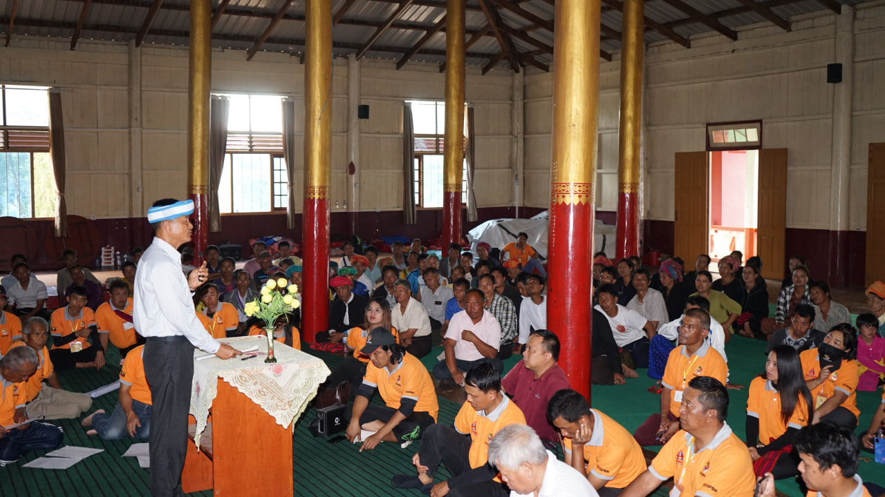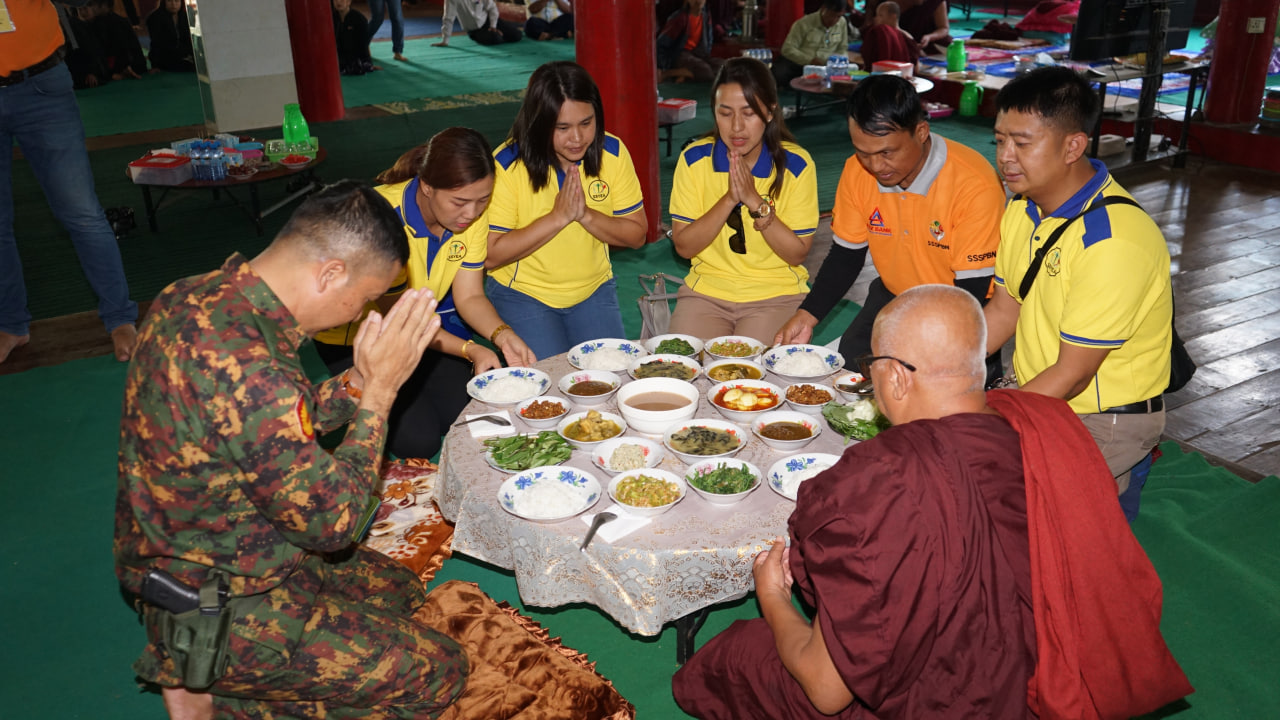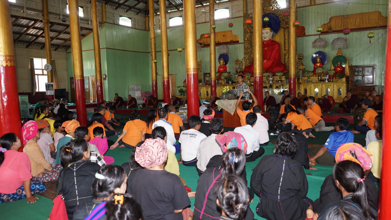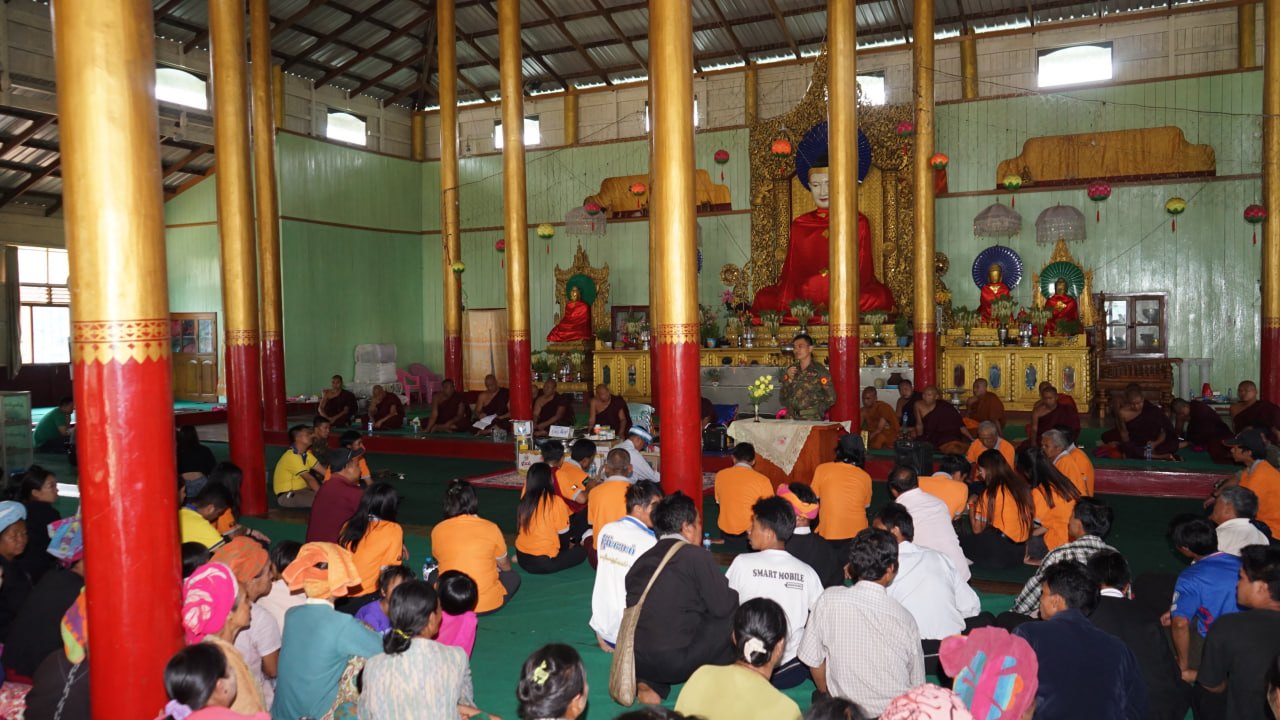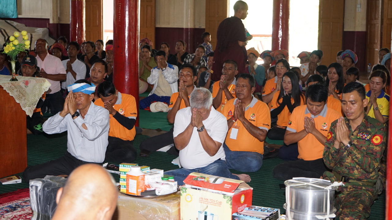ဦးစွာ ပအိုဝ်းကိုယ်ပိုင်အုပ်ချုပ်ခွင့်ရဒေသ စီမံအုပ်ချုပ်ရေးအဖွဲ့ဥက္ကဋ္ဌ ဦးခွန်ရဲထွေးနှင့်အဖွဲ့ဝင်များ၊ ဟိုပုံးတပ်နယ်မှူး ဗိုလ်မှူးချုပ် သိန်းနိုင်၊ မြို့နယ်စီမံအုပ်ချုပ်ရေးအဖွဲ့ဥက္ကဋ္ဌ ဦးမြင့်ထွန်းနှင့် တာဝန်ရှိသူများ၊ အလှူရှင်များက ဆရာတော်၊ သံဃာတော်များအား ဩကာသကန်တော့ကျိုးဖြင့် ရှိခိုး ကန်တော့၍ ဆရာတော်၊ သံဃာတော်များထံမှ ဩဝါဒကထာနှင့် ပရိတ်တရားတော်များကို နာယူဆောက်တည်ကြသည်။ ထို့နောက် ပအိုဝ်းကိုယ်ပိုင်အုပ်ချုပ်ခွင့်ရဒေသ စီမံအုပ်ချုပ်ရေးအဖွဲ့ဥက္ကဋ္ဌ ဦးခွန်ရဲထွေးက မဲနယ်တောင်ဒေသ ရေဘေးသင့်ပြည်သူများအားတွေ့ဆုံ အားပေးစကားပြောကြားပြီး မိုးသည်းထန်စွာရွာသွန်းပြီး မြေပြိုမှုကြောင့် ပိတ်ဆို့နေသည့်လမ်းများ၊ ပျက်စီးသွားသည့် တံတားများအား ဌာနဆိုင်ရာများ၊ ဒေသခံပြည်သူများစုပေါင်း၍ စက်ယန္တရား များအသုံးပြုကာ နေ့စဉ်ရှင်းလင်း ဆောင်ရွက်ပေးနေမှုအခြေအနေများကို လည်းကောင်း၊ ဟိုပုံးတပ်နယ်မှူး ဗိုလ်မှူးချုပ် သိန်းနိုင်က မဲနယ်တောင်ဒေသရှိ ရေဘေးသင့်ပြည်သူများအား အားပေးစကား ပြောကြားသည်။ ယင်းနောက် ရှမ်းပြည်နယ် စားနပ်ရိက္ခာ ထောက်ပံ့ရေးကော်မတီဥက္ကဋ္ဌ ဦးသိန်းဟန်က စားသောက်ဖွယ်ရာများနှင့် အခြားအသုံးအဆောင်ပစ္စည်းများ လှူဒါန်းထောက်ပံ့ရခြင်းနှင့်ပတ်သက်၍ ရှင်းလင်းပြောကြားသည်။ ထို့နောက် အလှူရှင်များက နောင်တောင်းပရဟိတတပ်ဦးဘုန်း တော်ကြီးကျောင်းဆရာတော်နှင့် လုံးဟီးကျေးရွာဘုန်းတော်ကြီးကျောင်း ဆရာတော်တို့အား အလှူငွေများဆက်ကပ်လှူဒါန်းကြ သည်။