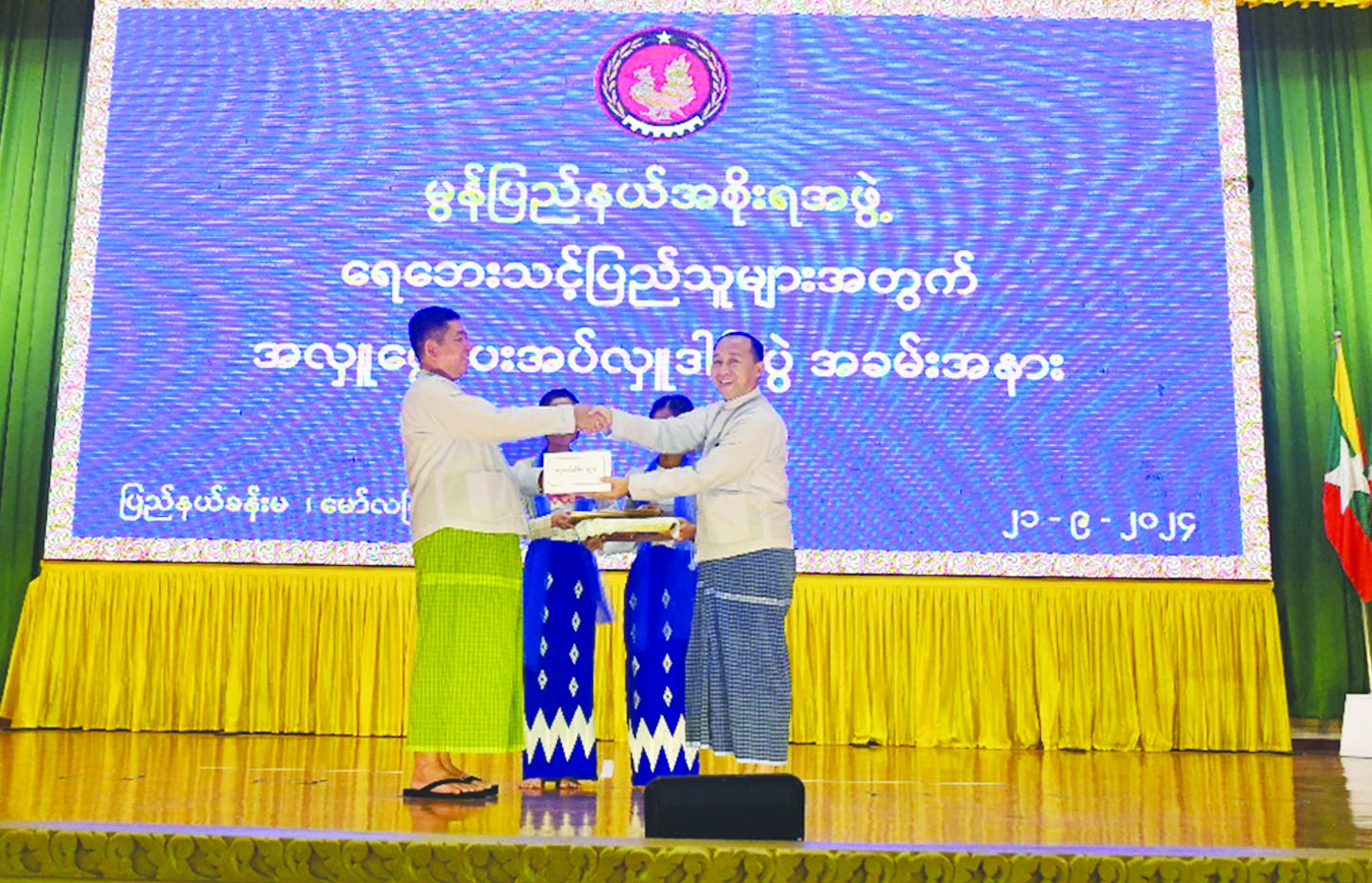 ရာဂိမုန်တိုင်းကြောင့် နေပြည်တော်ကောင်စီနယ်မြေအပါအဝင် တိုင်းဒေသကြီးနှင့် ပြည်နယ်အသီးသီးတို့တွင် ရေကြီးရေလျှံမှုများကြောင့် ပျက်စီးဆုံးရှုံးမှုများ ဖြစ်ပေါ်ခဲ့သည့် ရေဘေးသင့်ပြည်သူများအတွက် အလှူငွေပေးအပ်ပွဲကို ယနေ့ညနေပိုင်းတွင် မွန်ပြည်နယ်၊ မော်လမြိုင်မြို့၊ ပြည်နယ်ခန်းမ၌ ပြုလုပ်ရာ ပြည်နယ်ဝန်ကြီးချုပ် ဦးအောင်ကြည်သိန်း၊ အရှေ့တောင်တိုင်းစစ်ဌာနချုပ် တိုင်းမှူး ဗိုလ်ချုပ်ကျော်လင်းမောင်၊ ပြည်နယ်အစိုးရအဖွဲ့ဝင် ဝန်ကြီးများ၊ ပြည်နယ်အဆင့် ဌာနဆိုင်ရာများ၊ မြို့မိ/ မြို့ဖများနှင့် အလှူရှင်များ၊ လူမှုရေးအသင်းအဖွဲ့များ၊ ပရဟိတအဖွဲ့များ တက်ရောက်ကြသည်။