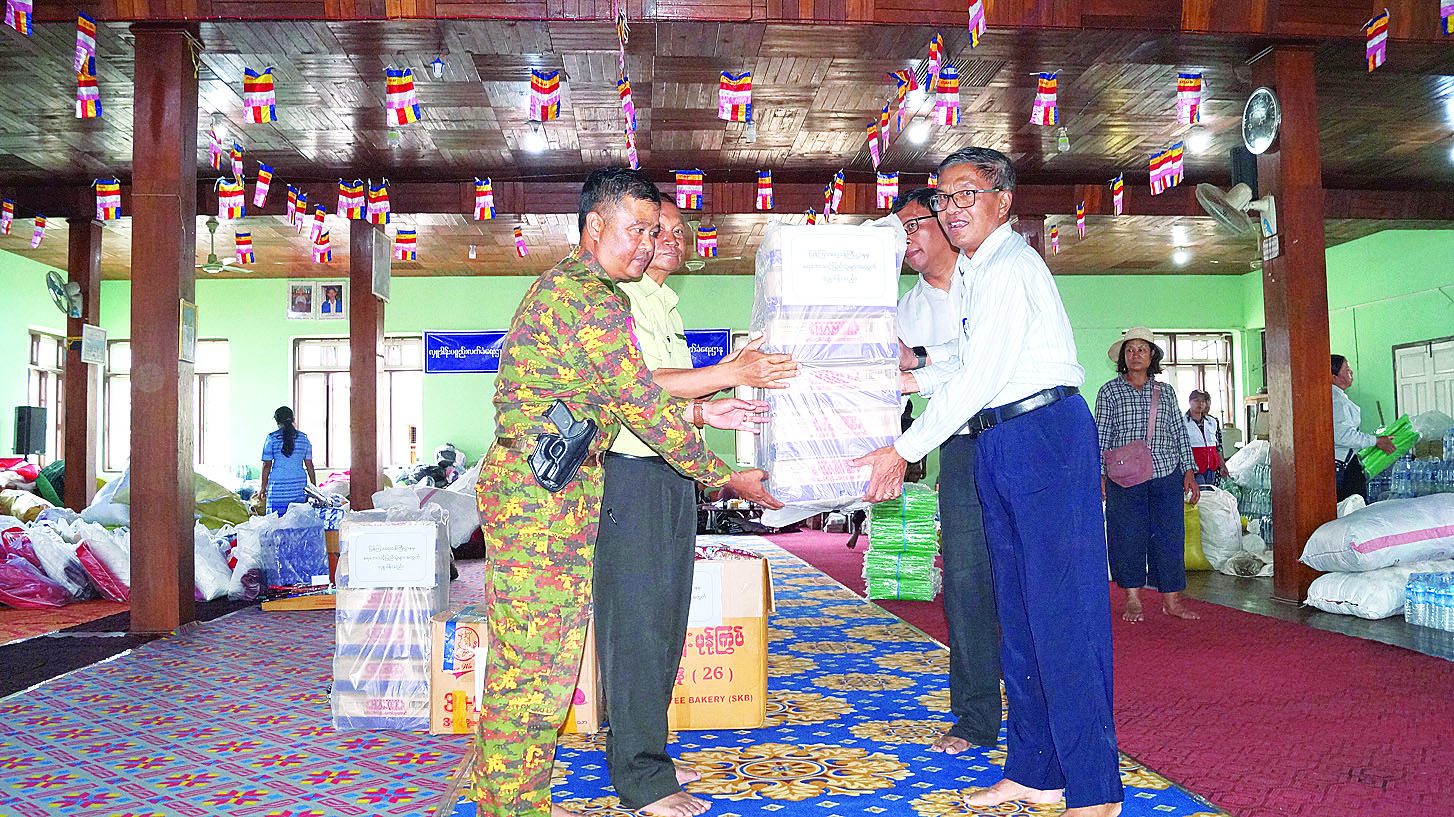 ထို့နောက် ရုံးအတွင်းရေဝင်မှုကြောင့် တင်ကျန်ရစ်သောနုန်းမြေများ၊ အမှိုက်သရိုက်များ ရှင်းလင်းပေးနေသည့် နယ်မြေခံတပ်မတော်သားများ၊ လူမှုအဖွဲ့အစည်းများ၊ ကျေးရွာရပ်ကွက်များမှ စေတနာရှင်လုပ်အားပေးအဖွဲ့များအား တွေ့ဆုံ၍ ကျေးဇူးတင်စကားပြောကြားကာ ဂုဏ်ပြုချီးမြှင့်ငွေ ပေးအပ်သည်။