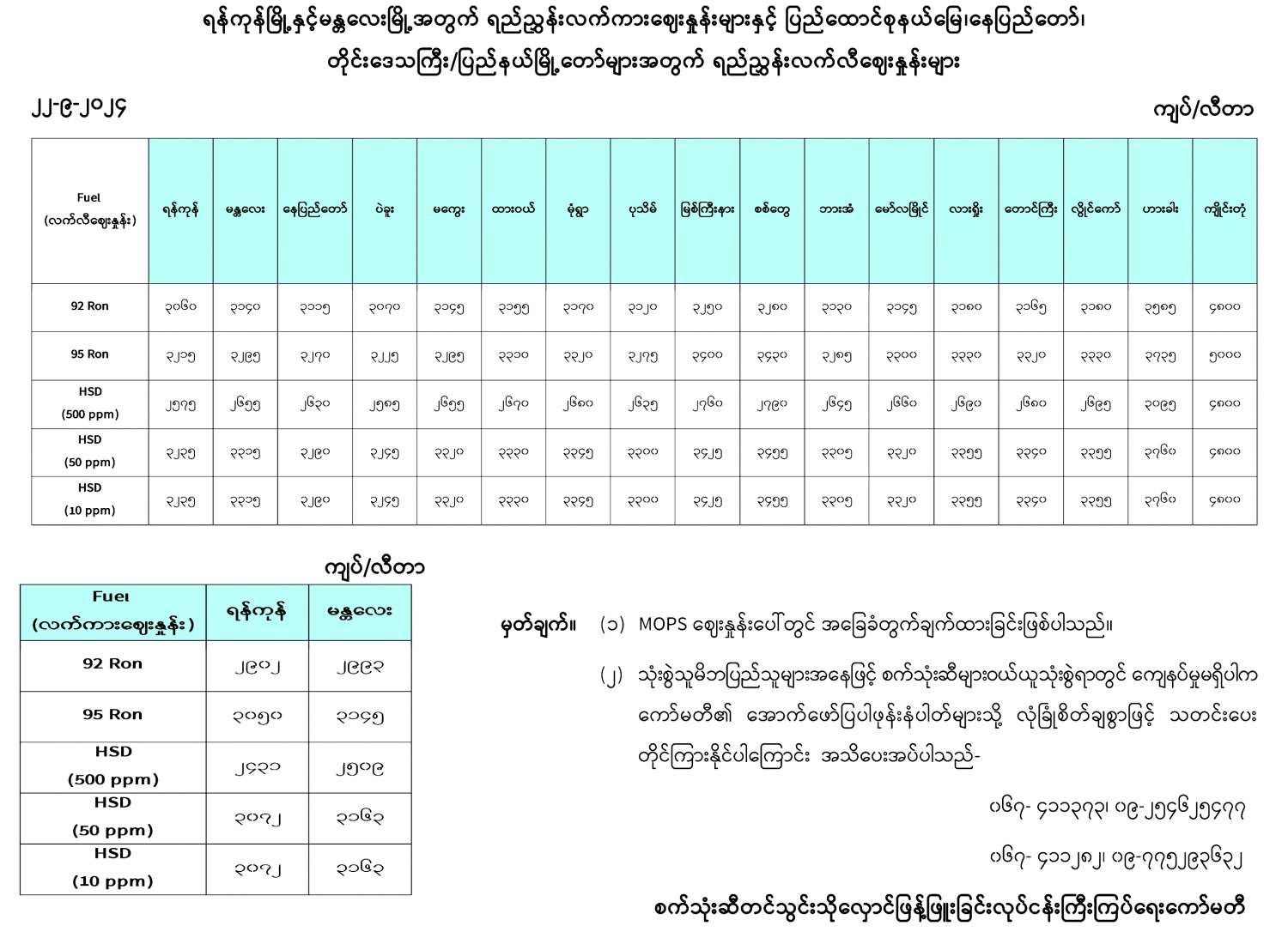 ရန်ကုန်မြို့နှင့် မန္တလေးမြို့အတွက် ရည်ညွှန်းလက်ကားဈေးနှုန်းများနှင့် ပြည်ထောင်စုနယ်မြေ နေပြည်တော်၊ တိုင်းဒေသကြီး/ ပြည်နယ် မြို့တော်များအတွက် ရည်ညွှန်းလက်လီဈေးနှုန်းများ 09/22/2024