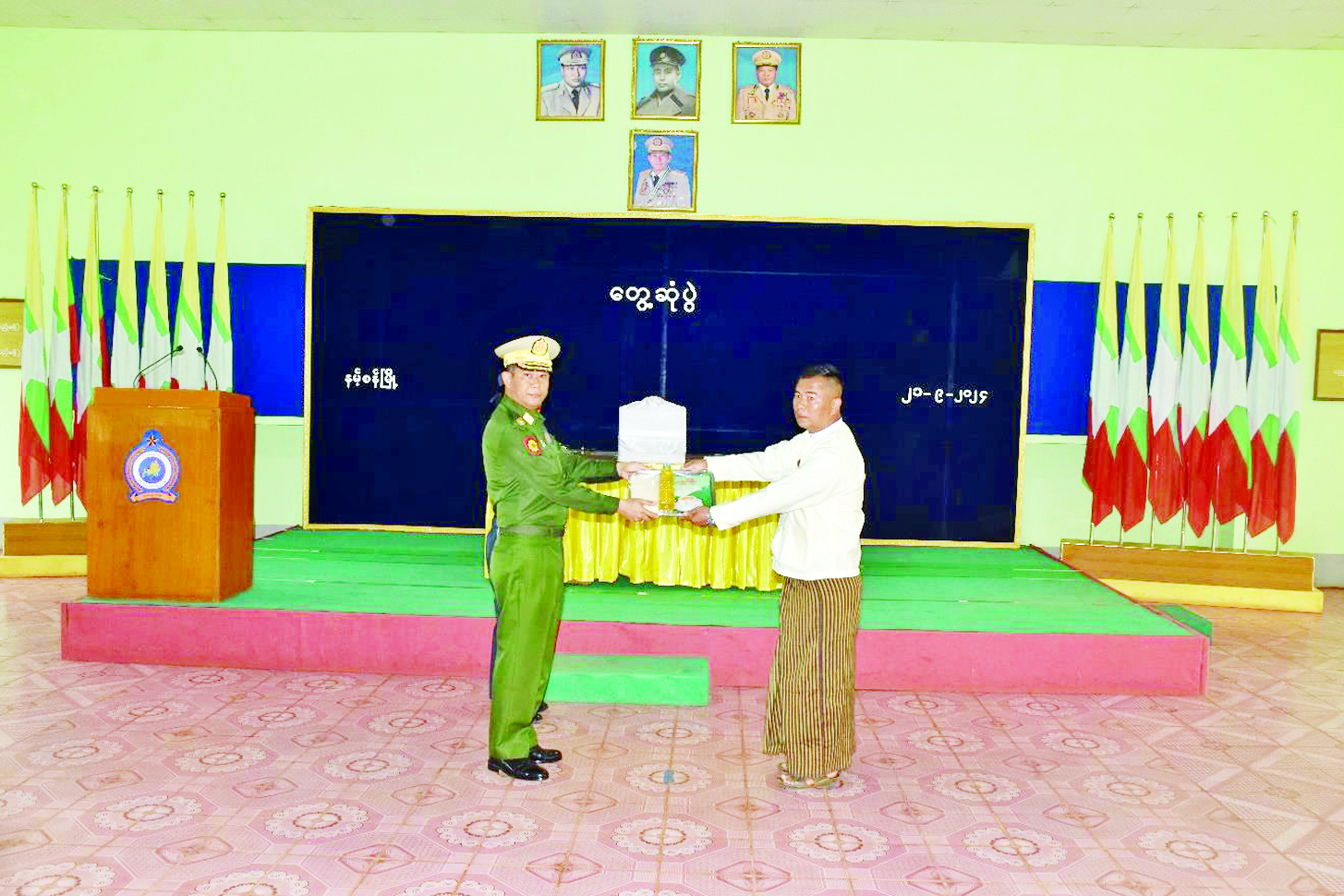 ရှမ်းပြည်နယ်(တောင်ပိုင်း) နမ့်စန်မြို့ရှိ စစ်မှုထမ်းဟောင်းအဖွဲ့ဝင်များနှင့် မိသားစုဝင်များအား ယနေ့နံနက်ပိုင်းတွင် အရှေ့အလယ်ပိုင်းတိုင်းစစ်ဌာနချုပ် တိုင်းမှူး ဗိုလ်ချုပ်မျိုးမင်းထွန်းနှင့် တာဝန်ရှိသူများက နယ်မြေခံတပ်ရင်းခန်းမ၌ သွားရောက်တွေ့ဆုံသည်။