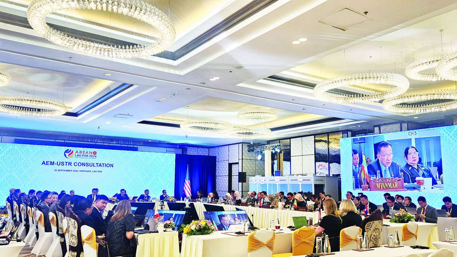 ဆက်လက်၍ ပြည်ထောင်စုဝန်ကြီးသည် အဖွဲ့ဝင်နိုင်ငံများမှ ဝန်ကြီးများနှင့်အတူ အာဆီယံနှင့် အမေရိကန်စီးပွားရေးဝန်ကြီးများ အစည်းအဝေးသို့ တက်ရောက်၍ အာဆီယံ - အမေရိကန် ကုန်သွယ်မှုနှင့် ရင်းနှီးမြှုပ်နှံမှု မူဘောင်အစီအစဉ်နှင့် စီးပွားရေးပူးပေါင်းဆောင်ရွက်မှု တိုးချဲ့အစီအစဉ် ၂၀၂၃-၂၀၂၄ ၏ အကောင်အထည်ဖော်မှုများအပေါ် ညှိနှိုင်းဆွေးနွေးခဲ့ပြီး အာဆီယံ - အမေရိကန်ကုန်သွယ်မှုနှင့် ရင်းနှီးမြှုပ်နှံမှု မူဘောင်အစီအစဉ်နှင့် စီးပွားရေးပူးပေါင်းဆောင်ရွက်မှုတိုးချဲ့အစီအစဉ် ၂၀၂၄ -၂၀၂၅ ကို အတည်ပြုခဲ့သည်။