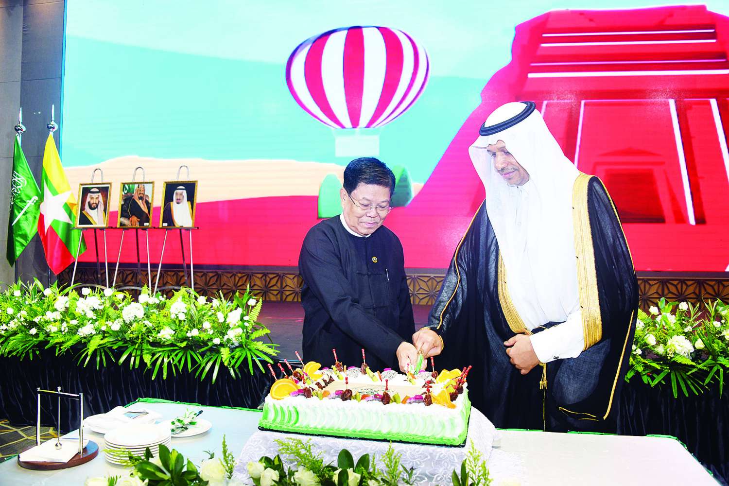 ဆက်လက်၍ ဒုတိယဝန်ကြီးချုပ်နှင့် ပြည်ထောင်စုဝန်ကြီးနှင့် မြန်မာနိုင်ငံဆိုင်ရာ ဆော်ဒီအာရေဗျနိုင်ငံသံအမတ်ကြီး H.E.Mr.Saud Abdullah Alsubaie တို့က ဆော်ဒီအာရေဗျနိုင်ငံ၏ (၉၄) နှစ်မြောက် အမျိုးသားနေ့အထိမ်းအမှတ်ကိတ်ကို လှီးဖြတ်ပေးကြသည်။