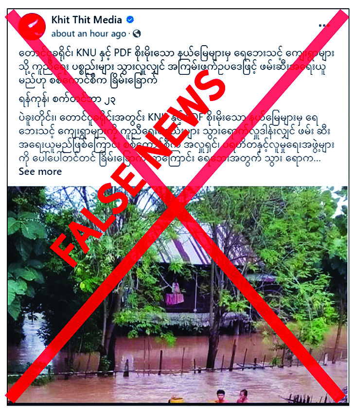 ရေကြီးရေလျှံမှုများ ဖြစ်ပေါ်ခဲ့သည့် တိုင်းဒေသကြီးနှင့် ပြည်နယ်များမှ မြို့နယ်၊ ရပ်ကွက်၊ ကျေးရွာများတွင် ကူညီကယ်ဆယ်ရေးနှင့် ပြန်လည်ထူထောင်ရေးလုပ်ငန်းများကို သက်ဆိုင်ရာ လူမှုကူညီရေးအသင်းအဖွဲ့များနှင့် တပ်မတော်သားများ၊ မြန်မာနိုင်ငံရဲတပ်ဖွဲ့ဝင်များ၊ ကြက်ခြေနီတပ်ဖွဲ့ဝင်များ၊ မီးသတ်တပ်ဖွဲ့ဝင်များက အင်တိုက်အားတိုက် ပူးပေါင်းဆောင်ရွက်လျက်ရှိသည်ကို တရားမဝင်ပြည်ဖျက်မီဒီယာများက လုံခြုံရေးတာဝန်ရှိသူများအပေါ် ပြည်သူလူထုမှ အထင်အမြင်လွဲမှားစေရန် မဟုတ်မမှန်စွပ်စွဲရေးသားပြီး လှုံ့ဆော်ဝါဒဖြန့်ဝေနေခြင်းသာဖြစ်ကြောင်း သတင်းရရှိသည်။