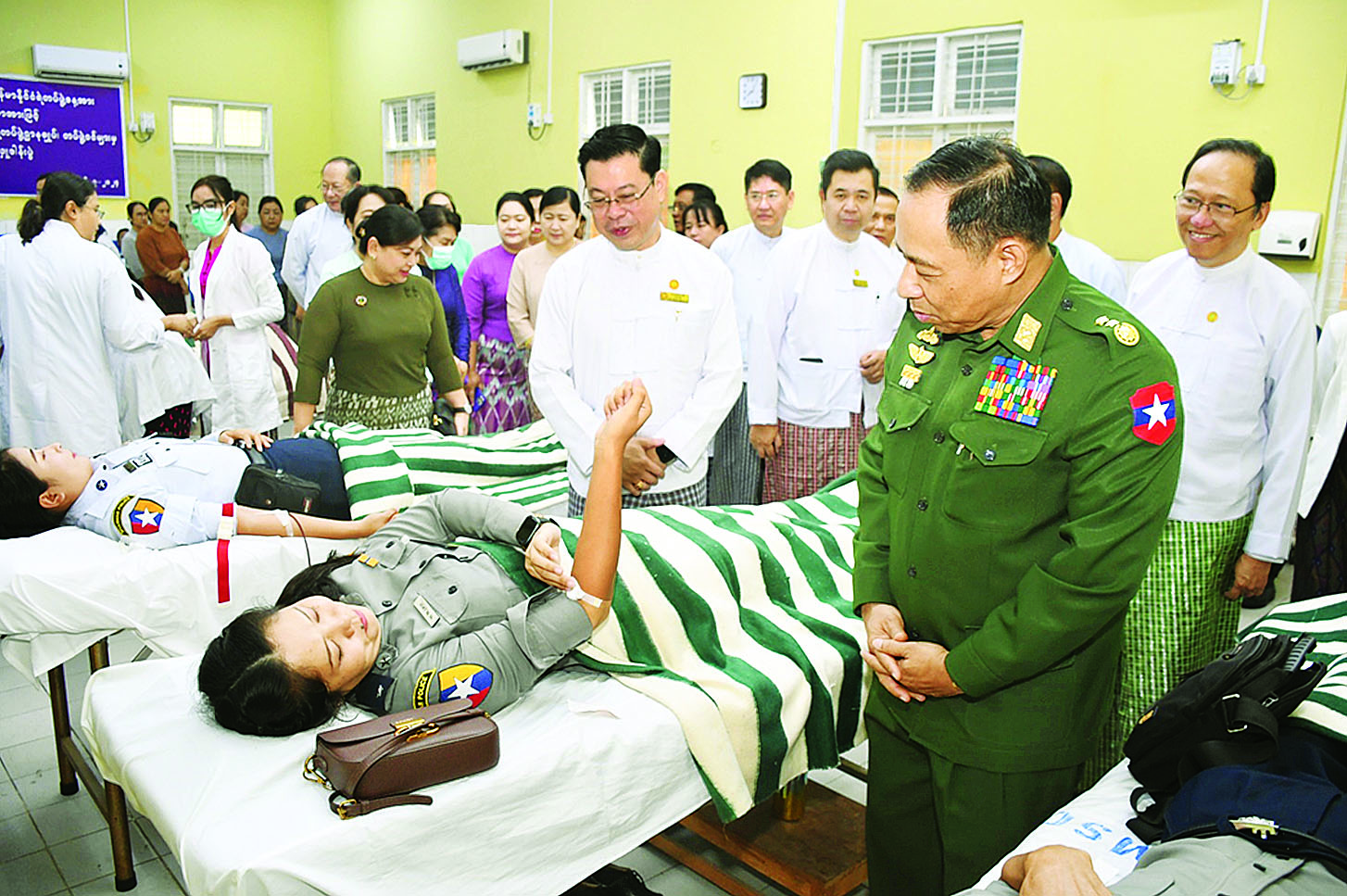 ထိုသို့ စုပေါင်းသွေးလှူဒါန်းကြသည့် သွေးလှူရှင်တပ်ဖွဲ့ဝင်နှင့် စာရေးဝန်ထမ်းများအား နိုင်ငံတော်စီမံအုပ်ချုပ်ရေးကောင်စီအဖွဲ့ဝင် ပြည်ထဲရေးဝန်ကြီးဌာန ပြည်ထောင်စုဝန်ကြီး ဒုတိယဗိုလ်ချုပ်ကြီး ရာပြည့်၊ ကျန်းမာရေးဝန်ကြီးဌာန ပြည်ထောင်စုဝန်ကြီး ဒေါက်တာသက်ခိုင်ဝင်း၊ ပြည်ထဲရေးဝန်ကြီးဌာန ဒုတိယဝန်ကြီး ဗိုလ်ချုပ်တိုးရီ၊ ကျန်းမာရေးဝန်ကြီးဌာန ဒုတိယဝန်ကြီး ဒေါက်တာအေးထွန်း၊ ပြည်ထဲရေးဝန်ကြီးဌာန အမြဲတမ်းအတွင်းဝန် ဦးခိုင်ထွန်းဦး၊ ပြည်ထဲရေးဝန်ကြီးဌာနနှင့် ကျန်းမာရေးဝန်ကြီးဌာနတို့မှ ညွှန်ကြားရေးမှူးချုပ်များ၊ မြန်မာနိုင်ငံရဲတပ်ဖွဲ့မှ ဒုတိယရဲချုပ်(၁)နှင့် ရဲအရာရှိကြီးများ၊ နေပြည်တော်ပြည်သူ့ဆေးရုံကြီး (ခုတင်-၁၀၀၀) မှ ဆေးရုံအုပ်ကြီး ပါမောက္ခ ဒေါက်တာရဲမြင့်နှင့် တာဝန်ရှိသူများ၊ ဇေယျာသီရိမြို့နယ်ရှိ တပ်မတော် ဆေးရုံကြီး(ခုတင်-၁၀၀၀)မှ တာဝန်ရှိသူများက ကြည့်ရှုအားပေးကြပြီး အာဟာရဖြည့်စွက်စာများနှင့် အားဆေးများ ထောက်ပံ့ပေးအပ်ကြသည်။