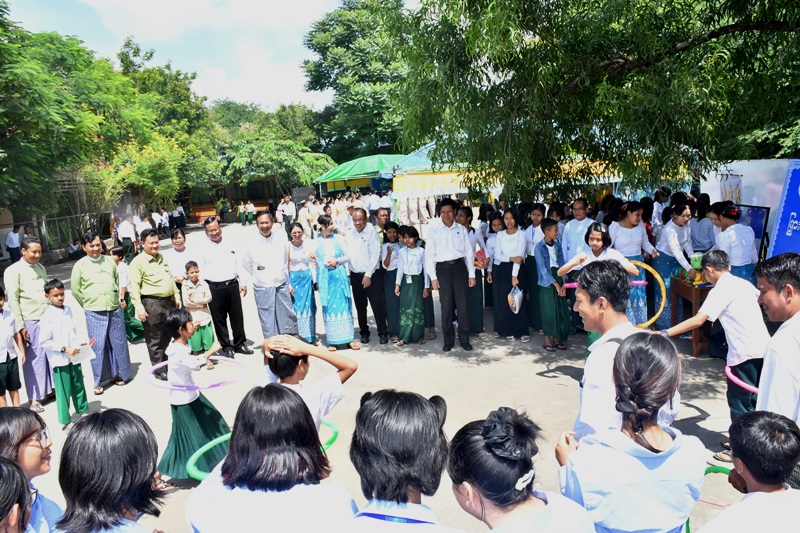 ၎င်းနောက် တိုင်းဒေသကြီးဝန်ကြီးချုပ်နှင့်အဖွဲ့သည် ကျောင်းခန်းမအသီးသီးရှိ ကလေးစာဖတ်ခန်း၊ စာဖတ်စွမ်းရည်ပြိုင်ပွဲ၊ ဆေးရောင်ခြယ်ပြိုင်ပွဲ၊ ကာတွန်းပြိုင်ပွဲ၊ ကလေးပန်းချီပြိုင်ပွဲ၊ ပုံပြင်ပြောပြိုင်ပွဲ၊ ကျပန်းစကားပြောပြိုင်ပွဲ၊ စက္ကူခေါက်ပြိုင်ပွဲ၊ စကားပုံဆက်နှင့် အရုပ်ဆက် ပြိုင်ပွဲ၊ မြှားပစ်ပြိုင်ပွဲ၊ ဂိုးကျဉ်းသွင်း၊ ဗူပေါင်းဖေါက်၊ဘောလုံးဖေါက်ပြိုင်ပွဲများ၊ အာလူးကောက်၊ ဂုံနီအိတ်စွတ်အပြေးပြိုင်ပွဲ၊ ဗန်းရွက်ပြိုင်ပွဲ၊ ခါးကွင်းလှည့်၊ စက်ဝိုင်းလှည့်ပြိုင်ပွဲများ၊ ခင်းကျင်းပြသထားသည့် စာအုပ်စာစောင်များနှင့် ဆင်ရုပ်ချိုးအနာပညာပြခန်း၊ ခရိုင်အသေးစား စက်မှုလက်မှုဦးစီးဌာနပြခန်း၊ နည်းပညာ၊ သက်မွေးပညာနှင့်လေ့ကျင့်ရေးဆရာ အတတ်သင်ကာ လိပ်ပြခန်း၊ အစိုးရစက်မှုလက်မှုသိပ္ပံနှင့်အစိုးရနည်းပညာ အထက်တန်းကျောင်းပြခန်း၊ မေတ္တာကိုယ်ပိုင်အထက်တန်းကျောင်းပြခန်း၊ ကိုယ်ပိုင်မူလတန်းကျောင်းများပြခန်း၊ ဇီဝနည်းပညာသုတေသနဦးစီးဌာနပြခန်း၊ ခရိုင်ပတ်ဝန်းကျင်ထိန်းသိမ်းရေးဦးစီးဌာနနှင့် ခရိုင်သစ်တောဦးစီးဌာနပြခန်းများအား လှည့်လည်ကြည့်ရှုအားပေးကြကြောင်း သိရသည်။