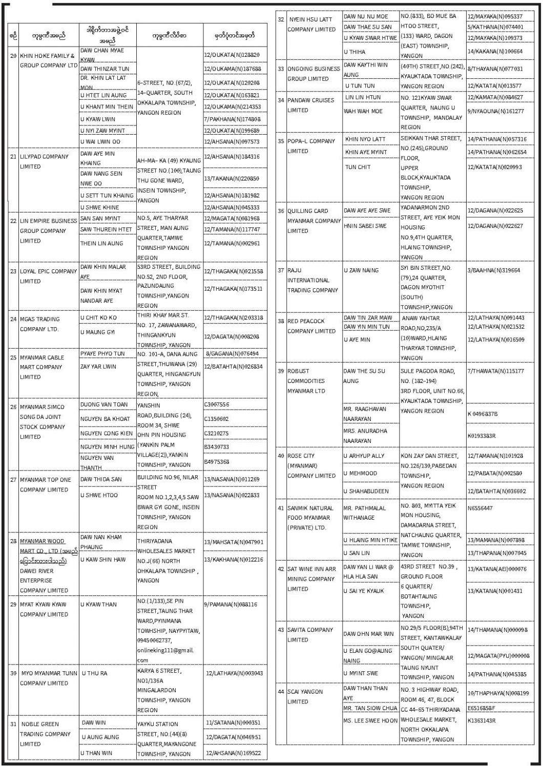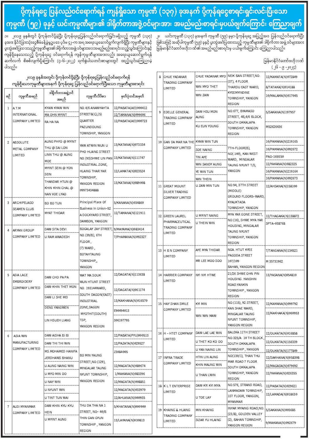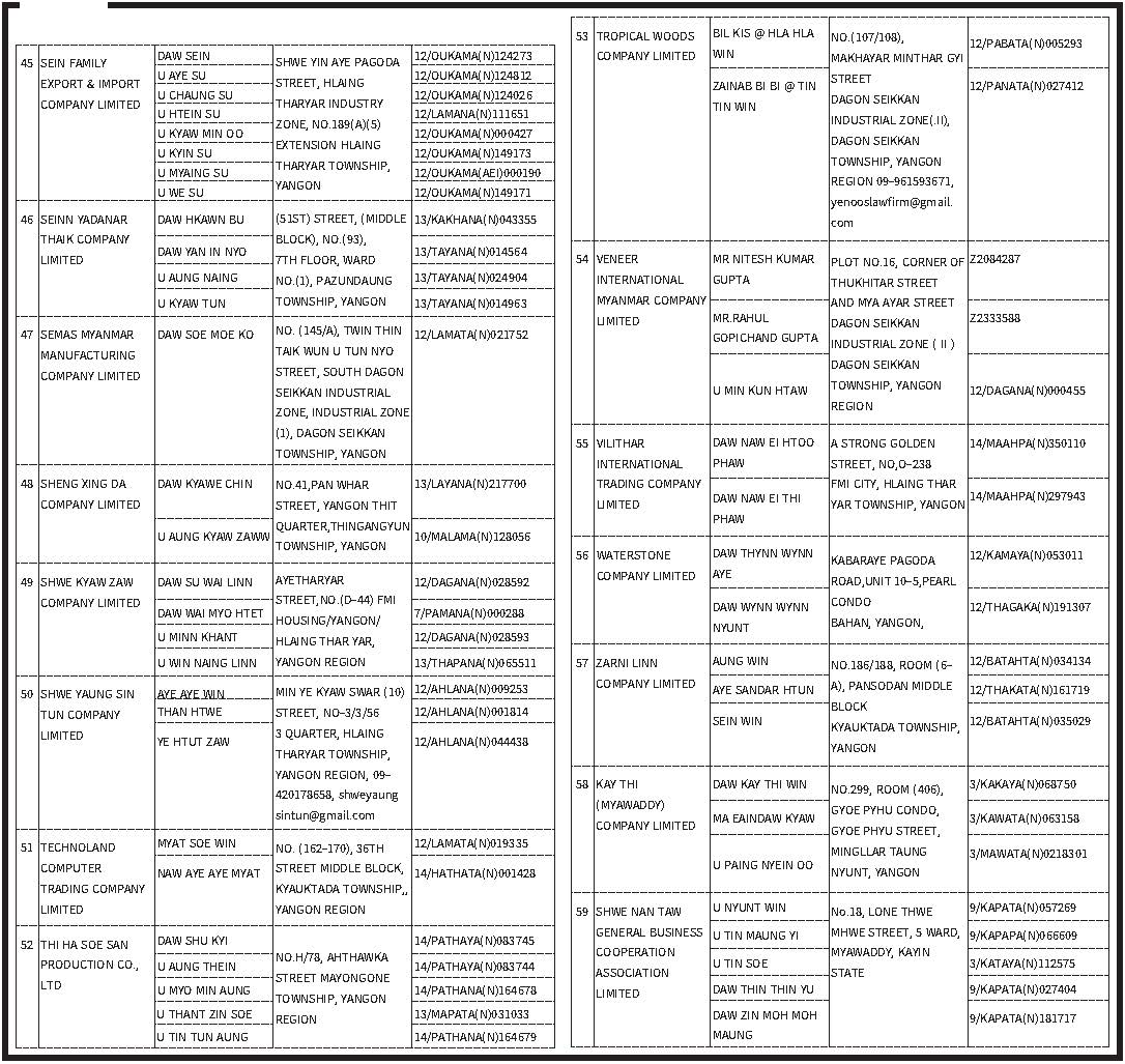 ပို့ကုန်ရငွေ ပြန်လည်ဝင်ရောက်ရန်ကျန်ရှိသော ကုမ္ပဏီ(၁၃၇)ခုအနက် ပို့ကုန်ရငွေစာရင်းရှင်းလင်းပြီးသော ကုမ္ပဏီ (၅၉) ခုနှင့် ယင်းကုမ္ပဏီများ၏ ဒါရိုက်တာအဖွဲ့ဝင်များအား အမည်မည်းစာရင်းမှပယ်ဖျက်ကြောင်း ကြေညာချက်