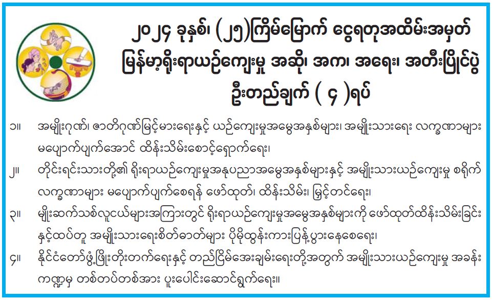 ၂၀၂၄ ခုနှစ်၊ (၂၅)ကြိမ်မြောက် ငွေရတုအထိမ်းအမှတ် မြန်မာ့ရိုးရာယဉ်ကျေးမှု အဆို၊ အက၊ အရေး၊ အတီးပြိုင်ပွဲဦးတည်ချက် (၄)ရပ် 09/27/2024