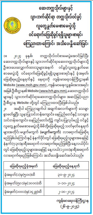 ဆေးတက္ကသိုလ်များနှင့် သွားဘက်ဆိုင်ရာ တက္ကသိုလ်ဝင်ခွင့် လူတွေ့နှုတ်မေးစာမေးပွဲသို့ ဝင်ရောက်ဖြေဆိုခွင့်ရရှိသူများစာရင်း ကြေညာထားကြောင်း အသိပေးနှိုးဆော်ခြင်း 09/27/2024