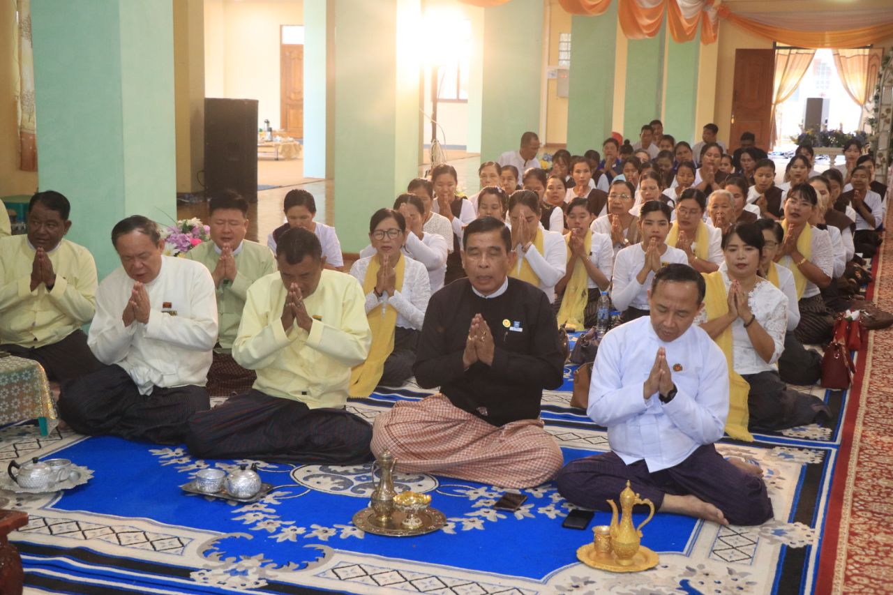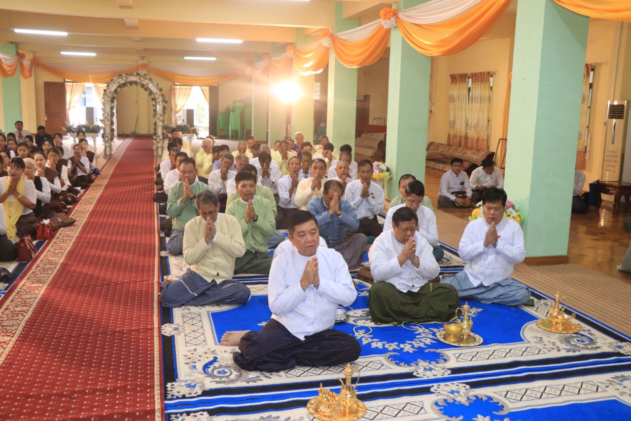 ရှေးဦးစွာ အခမ်းအနားကို နမောတဿသုံးကြိမ်ရွတ်ဆို ဘုရားကန်တော့ဖွင့်လှစ်ခဲ့ပြီး မော်လမြိုင်မြို့၊ မြစေတီစာသင်တိုက်ကြီး၏ ဦးစီးပဓာနနာယကဆရာတော် ဝိနယပါဠိပါရဂူ အဂ္ဂမဟာပဏ္ဍိတ ဘဒ္ဒန္တဝိမလဗုဒ္ဓိ အရှင်သူမြတ်ထံမှ သီလတော်မြတ်များ ခံယူဆောက်တည်ခဲ့ကြသည်။