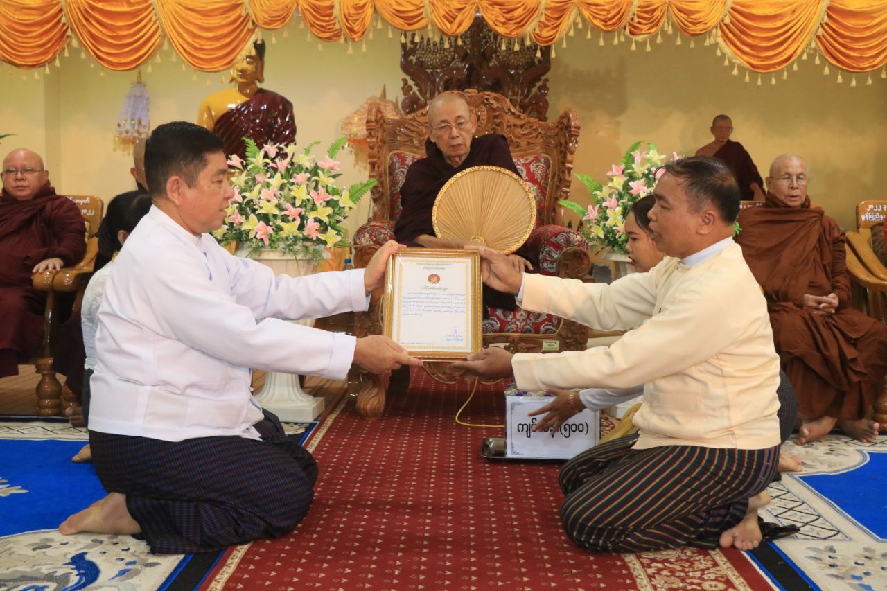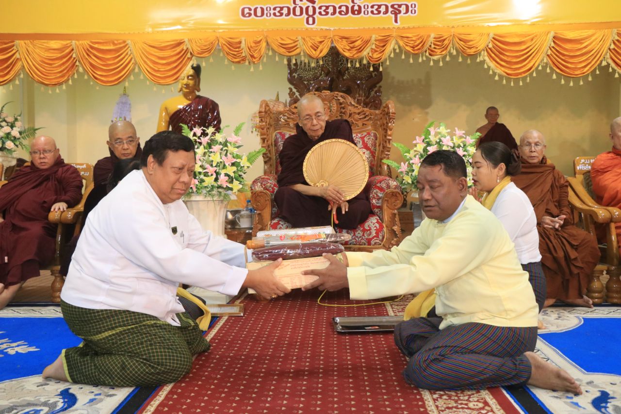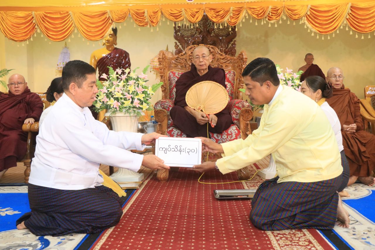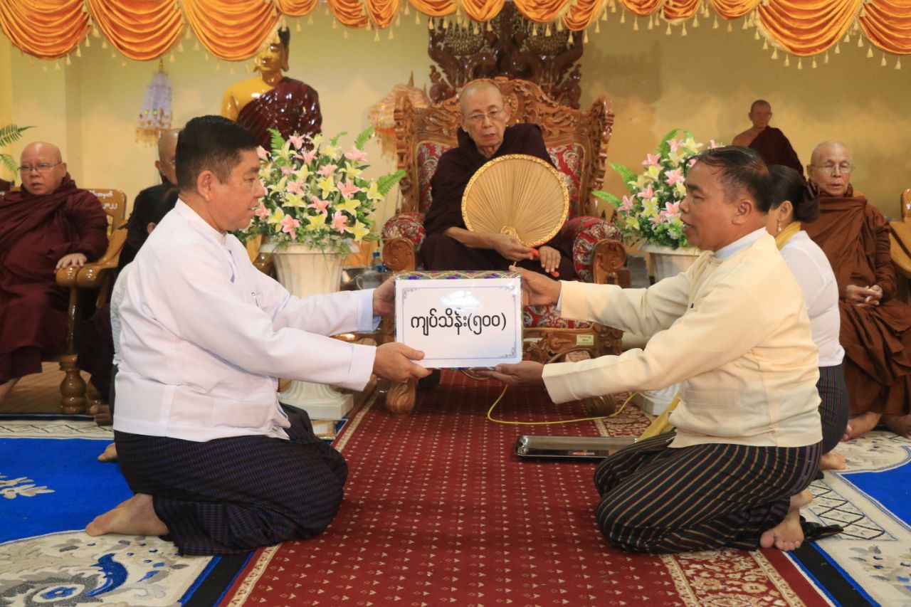 ဆက်လက်၍ ပြည်နယ်တရားလွှတ်တော် တရားသူကြီးချုပ်က မွန်ပြည်နယ်၊ မြို့နယ်များရှိ ဗုဒ္ဓဘာသာကလျာဏယုဝအသင်းများမှလှူဒါန်းသည့် သံဃာ့အသုံးအဆောင်ပစ္စည်းများနှင့် ရေဘေးသင့်ပြည်သူများအတွက် အဝတ်အထည် စားသောက်ကုန်အပါအဝင် ငွေကျပ်သိန်း (၅၅၀) တန်ဖိုးရှိ ပစ္စည်းများအား လွှဲပြောင်းပေးအပ်ခဲ့မှုအပေါ် လက်ခံရယူခဲ့ပြီး ဂုဏ်ပြုမှတ်တမ်းလွှာများ ပြန်လည်ပေးအပ်ခဲ့ကာ လှူဒါန်းမှုအစုစုတို့အတွက် အနုမောဒနာတရား နာယူကြည်ညိုခဲ့ကြပြီး ရေစက်သွန်းချအမျှပေးဝေ၍ အခမ်းအနားကို ဗုဒ္ဓသာသနံစိရံတိဋ္ဌတု (၃) ကြိမ်ရွတ်ဆို ရုပ်သိမ်းခဲ့ကြောင်း သိရှိရသည်။