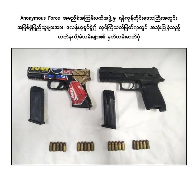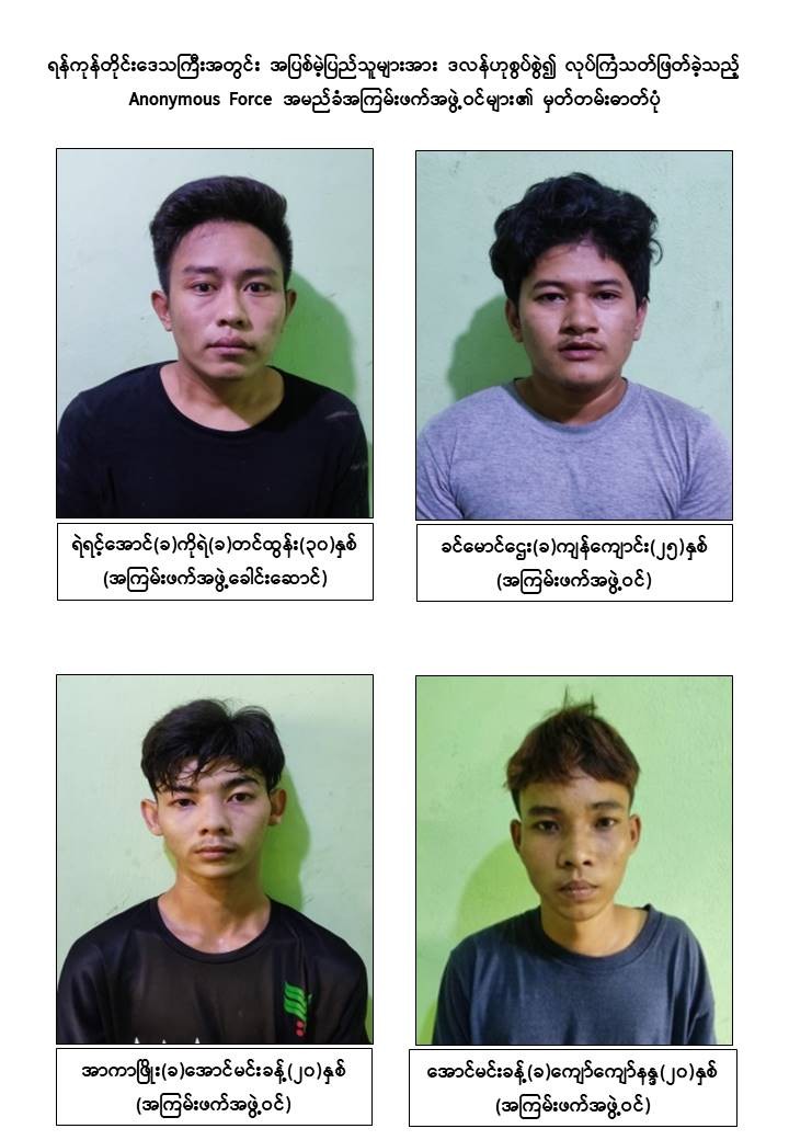 ထို့အပြင် ဖမ်းဆီးရမိတရားခံများ၏ ထွက်ဆိုချက်အရ Anonymous Force အမည်ခံ အကြမ်းဖက်အဖွဲ့ဝင်များသည် ၎င်းတို့နှင့် ပုဂ္ဂိုလ်ရေးအရ အဆင်မပြေသည့် ဌာနဆိုင်ရာဝန်ထမ်းများနှင့် အပြစ်မဲ့ပြည်သူများအား ဒလန်ဟုစွပ်စွဲ၍ အကြောင်းမဲ့လုပ်ကြံသတ်ဖြတ်မှု (၁) ကြိမ်၊ ဖောက်ခွဲဖျက်ဆီးမှု (၁) ကြိမ်ပြုလုပ်ခဲ့ကြောင်း ဖော်ထုတ်သိရှိရသည်-