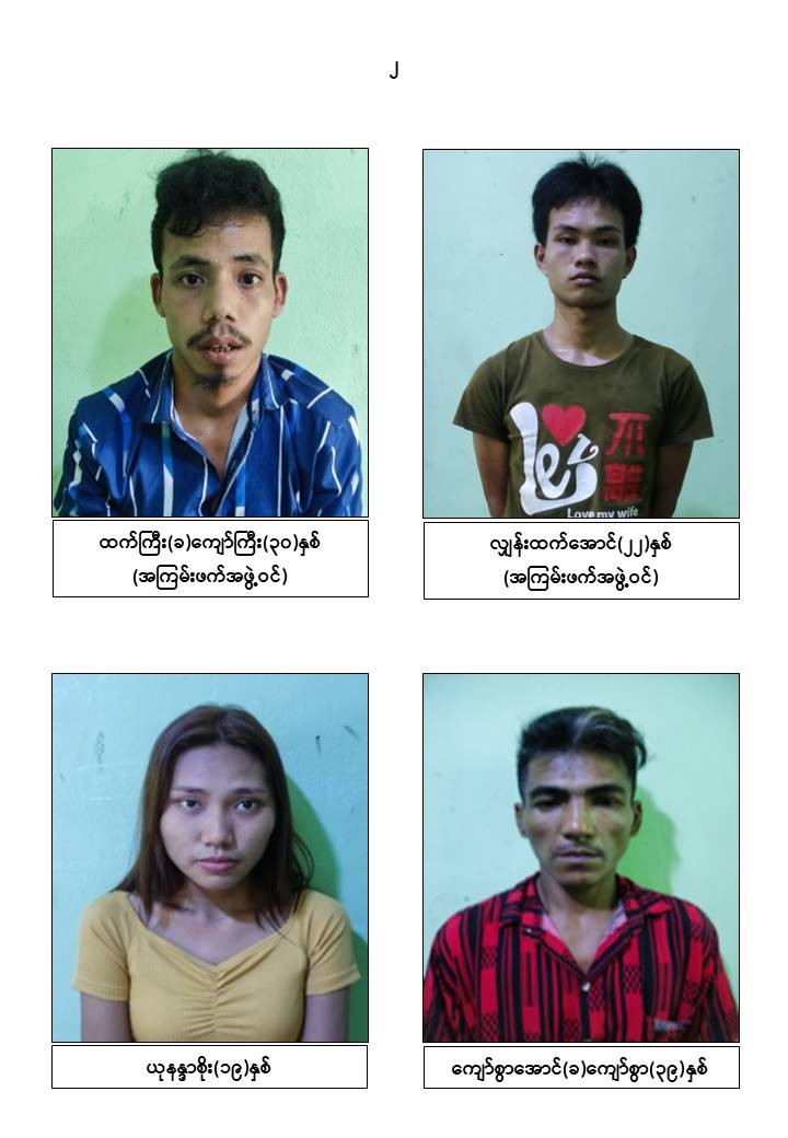 ဖြစ်စဉ်တွင် ရန်ကုန်တိုင်းဒေသကြီးအတွင်း ရပ်ကွက်အုပ်ချုပ်ရေးမှူး၊ ရာအိမ်မှူးတို့အား အကြောင်းမဲ့လုပ်ကြံသတ်ဖြတ်ခဲ့သည့် တရားခံ ကျား ၁၁ ဦး၊ မ ၁ ဦးတို့အား Sigsauer ပစ္စတိုသေနတ် ၁ လက်၊ Glock ပစ္စတို ၁ လက်၊ ကျည်အိမ် ၂ ခု၊ ၉ မမကျည် ၂၀ တောင့်တို့နှင့်အတူ ဖမ်းဆီးရမိခဲ့သည်။
