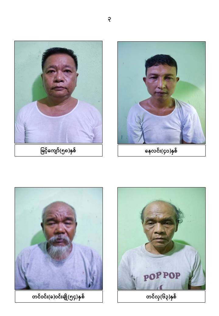 သို့ဖြစ်ပါ၍ ဖမ်းဆီးရမိတရားခံများအား ဥပဒေအရ ၎င်းတို့ကျူးလွန်ခဲ့သောပြစ်မှုများအတိုင်း ထိရောက်စွာအရေးယူနိုင်ရေး ဆက်လက်ဆောင်ရွက်သွားမည်ဖြစ်ပြီး အကြမ်းဖက်မှုဆောင်ရွက်နေသူများအား ပြည်သူတစ်ရပ်လုံးက ဝိုင်းဝန်းကာကွယ်တိုက်ဖျက်ကြရန်နှင့် ဆက်စပ်တရားခံများအား အမြန်ဆုံးဆက်လက်ဖမ်းဆီးရမိရေးအတွက် ၎င်းတို့ပုန်းခိုရာနေရာများ၊ လှုပ်ရှားသွားလာနေထိုင်မှု သတင်းများရရှိပါက သက်ဆိုင်ရာသို့ လျှို့ဝှက်စွာသတင်းပေးတိုင်ကြားနိုင်ပါကြောင်း၊ သတင်းပေးသူနှင့် ဖမ်းဆီးပေးသူများအား လျှို့ဝှက်ပေးထား၍ ဆုငွေများ ထိုက်တန်စွာ ချီးမြှင့်ပေးလျက်ရှိကြောင်းနှင့် မြို့ရွာများ အမြန်ဆုံးအေးချမ်းတည်ငြိမ်ရေးအတွက် ပြည်သူတစ်ရပ်လုံး ပူးပေါင်းပါဝင်ကြိုးပမ်းဆောင်ရွက်နိုင်ပါရန် မေတ္တာရပ်ခံအပ်ပါကြောင်း အသိပေးသတင်းထုတ်ပြန်အပ်ပါသည်။