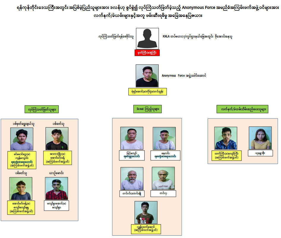 ဖမ်းဆီးရမိတရားခံများ၏ ထွက်ဆိုချက်အရ ၂၀၂၃ ခုနှစ်၊ နိုဝင်ဘာလခန့်တွင် တရားခံ ရဲရင့်အောင် (ခ) ကိုရဲ (ခ) တင်ထွန်း၊ ထက်ကြီး (ခ) ကျော်ကြီးနှင့် အာကာဖြိုး (ခ) အောင်မင်းခန့်တို့သည် KNLA တပ်မဟာ (၂) နယ်မြေသို့ သွားရောက်၍ အကြမ်းဖက်ဖောက်ခွဲဖျက်ဆီးရေးသင်တန်းအား ၁ လ တက်ရောက်ခဲ့ကြောင်း၊ အကြမ်းဖက်ဖောက်ခွဲဖျက်ဆီးရေးသင်တန်းဆင်းပြီးနောက် ရန်ကုန်မြို့သို့ ပြန်လာခဲ့ပြီး ၂၀၂၄ ခုနှစ်၊ ဖေဖော်ဝါရီလတွင် ပြည်သူလူထုကို အကြောက်တရားများဖြစ်ပေါ်စေရန်အတွက် အပြစ်မဲ့ပြည်သူများအား လုပ်ကြံသတ်ဖြတ်ရန် ရည်ရွယ်၍ Anonymous Force အမည်ခံ အကြမ်းဖက်အဖွဲ့အား ရဲရင့်အောင် (ခ) ကိုရဲ (ခ) တင်ထွန်း ခေါင်းဆောင်၍ ခင်မောင်ဌေး (ခ) ကျန်ကျောင်း၊ ထက်ကြီး (ခ) ကျော်ကြီး၊ အာကာဖြိုး (ခ) အောင်မင်းခန့်၊ လျှန်းထက်အောင်၊ အောင်မင်းခန့် (ခ) ကျော်ကျော်နန္ဒ၊ ဖမ်းဆီးရန်ကျန်တရားခံ ဖြိုးဇင်အောင်တို့ပါဝင်သော အဖွဲ့ဝင် ၇ ဦးဖြင့် ဖွဲ့စည်းခဲ့ကြောင်း၊ လုပ်ကြံသတ်ဖြတ်ရာတွင် အသုံးပြုခဲ့သည့် လက်နက်/ ခဲယမ်းများအား KNLA တပ်မဟာ (၇) တွင် ခိုအောင်းနေထိုင်လျက်ရှိသည့် ဖမ်းဆီးရန်ကျန် တရားခံ မှတ်ကြီး (ခ) မှုံကြီးမှ ပေးပို့ခဲ့ခြင်းဖြစ်ပြီး ထက်ကြီး (ခ) ကျော်ကြီးနှင့် ယုနန္ဒာစိုးတို့ထံတွင် သိုဝှက်သိမ်းဆည်းခဲ့ကြောင်း ဖော်ထုတ်သိရှိရသည်။