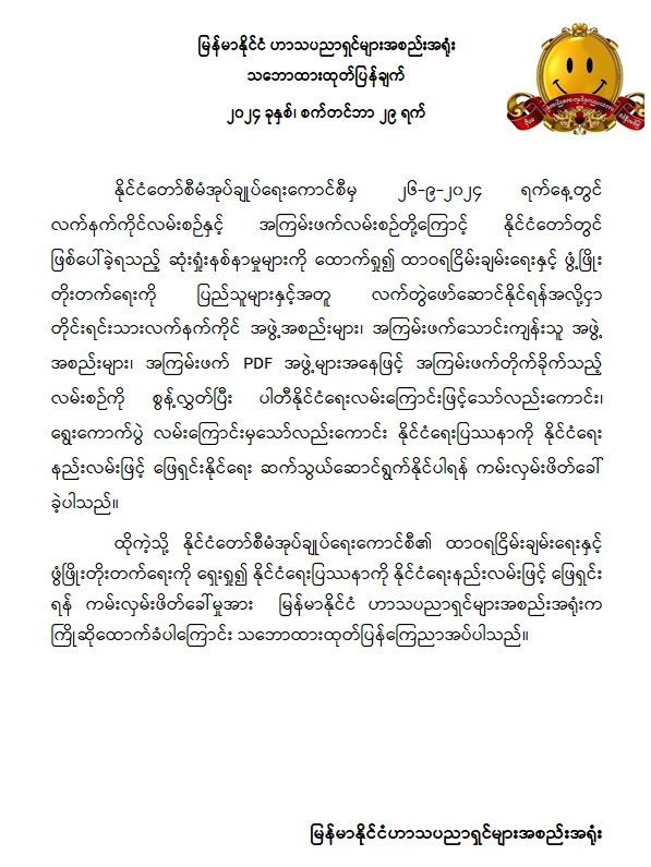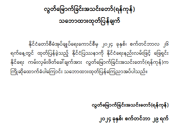 ထိုသို့ နိုင်ငံတော်စီမံအုပ်ချုပ်ရေးကောင်စီက နိုင်ငံတော်တွင်ဖြစ်ပေါ်ခဲ့ရသည့် ဆုံးရှုံးနစ်နာမှုမျာကိုထောက်ရှု၍ နိုင်ငံရေးပြဿနာအား နိုင်ငံရေးနည်းလမ်းဖြင့် ဖြေရှင်းရန် ကမ်းလှမ်းဖိတ်ခေါ်ခဲ့မှုအပေါ် ကြိုဆိုထောက်ခံပါကြောင်း ဗုဒ္ဓဘာသာကလျာဏယုဝအသင်း YMBA(ဗဟို)၊ ဘာသာပေါင်းစုံချစ်ကြည်ညီညွတ်ရေးအဖွဲ့(ဗဟို)၊ မြန်မာနိုင်ငံသတင်းမီဒီယာကောင်စီ၊ မြန်မာနိုင်ငံအားကစားမီဒီယာများအဖွဲ့ချုပ်၊ မြန်မာနိုင်ငံရုပ်ရှင်အစည်းအရုံး၊ မြန်မာနိုင်ငံစာရေးဆရာအသင်း၊ မြန်မာနိုင်ငံဂီတအစည်းအရုံး (ဗဟို)၊ လူမျိုးပေါင်းစုံညီညွတ်ရေးနှင့် အကျိုးဆောင်အဖွဲ့(ယာယီ)၊ မြန်မာနိုင်ငံပန်းချီပန်းပုအစည်းအရုံး(ဗဟို)၊ မြန်မာနိုင်ငံသဘင်အစည်းအရုံး (ဗဟို)၊ မြန်မာနိုင်ငံဟာသပညာရှင်များအစည်းအရုံး၊ မြန်မာနိုင်ငံဧဝံဂေလိ ခရစ်ယာန်မဟာမိတ်အဖွဲ့ချုပ်၊ ပြည်ထောင်စုမြန်မာနိုင်ငံ မက်သဒစ်အသင်းတော် (အောက်မြန်မာပြည်)၊ ယုံကြည်ခြင်း ဧဝံဂေလိအသင်းတော်(ပဲခူး)၊ လွတ်မြောက်ခြင်းအသင်းတော်(ရန်ကုန်)၊ မြန်မာနိုင်ငံလုံးဆိုင်ရာ ဟိန္ဒူဘာသာရေးဗဟိုအဖွဲ့ချုပ်၊ မြန်မာနိုင်ငံလုံးဆိုင်ရာ တမီလ်ဟိန္ဒူဖောင်ဒေးရှင်း (ဗဟို)၊ သနန္တဓမ္မပါလက (ဟိန္ဒူ) အဖွဲ့ချုပ်၊ မြန်မာနိုင်ငံလုံးဆိုင်ရာအစ္စလာမ်ဘာသာရေးအဖွဲ့ကြီးနှင့် ပိန္နဲကုန်းရခိုင်ဂျာမေဗလီတို့မှ ကြိုဆိုထောက်ခံပါကြောင်း သဘောထားများ အသီးသီးထုတ်ပြန်ခဲ့ကြကြောင်း သတင်းရရှိသည်။