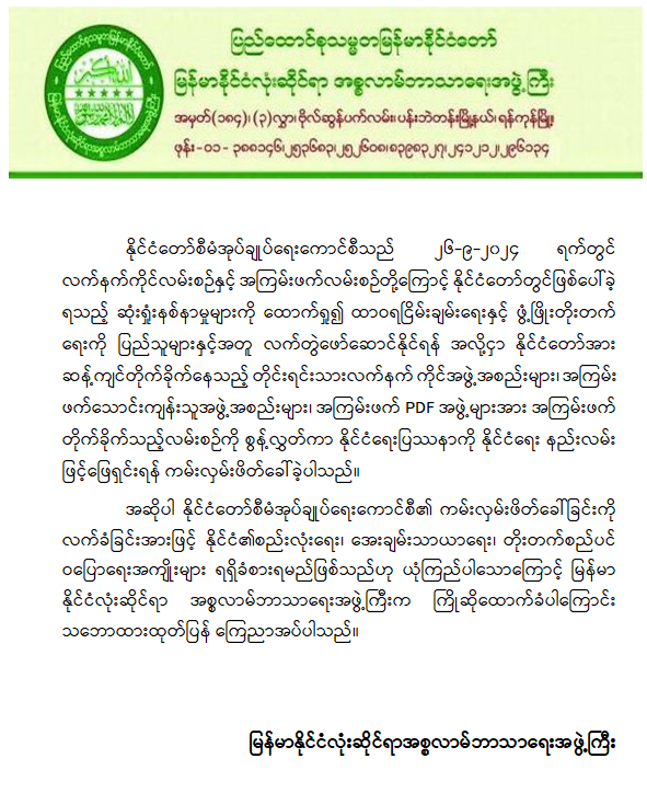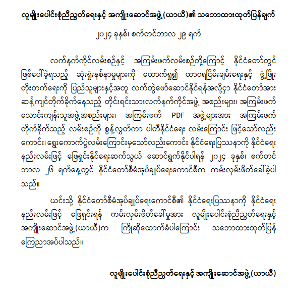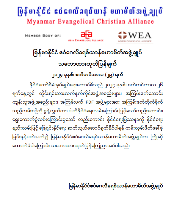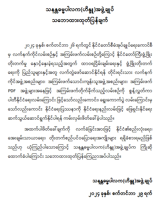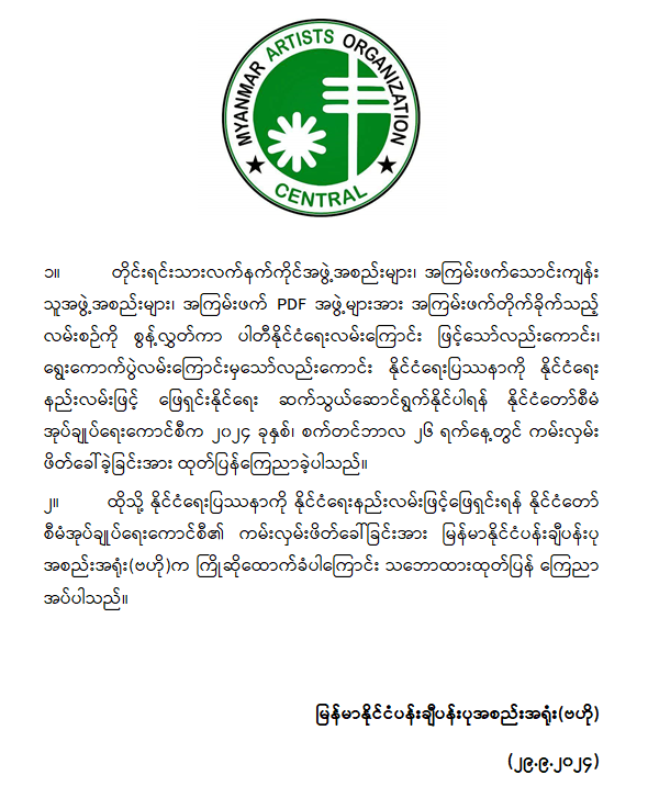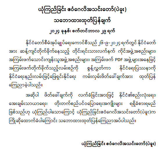 နိုင်ငံတော်စီမံအုပ်ချုပ်ရေးကောင်စီအနေဖြင့် လက်နက်ကိုင်လမ်းစဉ်နှင့် အကြမ်းဖက်လမ်းစဉ်တို့ကြောင့် နိုင်ငံတော်တွင်ဖြစ်ပေါ်ခဲ့ရသည့် ဆုံးရှုံးနစ်နာမှုမျာကိုထောက်ရှု၍ ထာဝရငြိမ်းချမ်းရေးနှင့် ဖွံ့ဖြိုးတိုးတက်ရေးကို ပြည်သူများနှင့်အတူ လက်တွဲဖော်ဆောင်နိုင်ရန်အလို့ငှာ နိုင်ငံတော်အားဆန့်ကျင်တိုက်ခိုက်နေသည့် တိုင်ရင်းသားလက်နက်ကိုင်အဖွဲ့အစည်းများ၊ အကြမ်းဖက်သောင်းကျန်သူအဖွဲ့အစည်းများ၊ အကြမ်းဖက် PDF အဖွဲ့များအား လက်နက်ကိုင်အကြမ်းဖက်တိုက်ခိုက်သည့် လမ်းစဉ်ကို စွန့်လွှတ်ကာ ပါတီနိုင်ငံရေးလမ်းကြောင်းဖြင့်သော်လည်းကောင်း၊ ရွေးကောက်ပွဲလမ်းကြောင်းမှသော်လည်းကောင်း နိုင်ငံရေးပြဿနာကို နိုင်ငံရေးနည်းလမ်းဖြင့် ဖြေရှင်းနိုင်ရေး ဆက်သွယ်ဆောင်ရွက်နိုင်ပါရန် ၂၀၂၄ ခုနှစ်၊ စက်တင်ဘာလ ၂၆ ရက်နေ့တွင် ကမ်းလှမ်းဖိတ်ခေါ်ခဲ့ပါသည်။