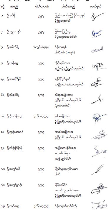 ၆။ သို့ပါ၍ အထက်အပိုဒ်ပါ ထုတ်ပြန်ကမ်းလှမ်းချက်သည် ပြည်သူတစ်ရပ်လုံး၏ အမှန်တကယ်လိုလားချက်အားကိုယ်စားပြုရာရောက်သည့် နိုင်ငံတော်၏ အပြုသဘောဆောင်သော ကမ်းလှမ်းချက်ဖြစ်သောကြောင့်လည်းကောင်း၊ နိုင်ငံတော်နှင့် နိုင်ငံသားအားလုံး၏ အကျိုးကို ရှေးရှုသော လိုက်နာပူးပေါင်းဆောင်ရွက်သင့်သည့် လုပ်ငန်းစဉ်တစ်ရပ်ဖြစ်ကြောင်း ရှုမြင်ပါသဖြင့် ၎င်းထုတ်ပြန်ချက်အပေါ် ကျွန်ုပ်တို့နိုင်ငံရေးပါတီများက အပြည့်အဝထောက်ခံအပ်ပါကြောင်း ပူးတွဲသဘောထားထုတ်ပြန်အပ်ပါသည်။
