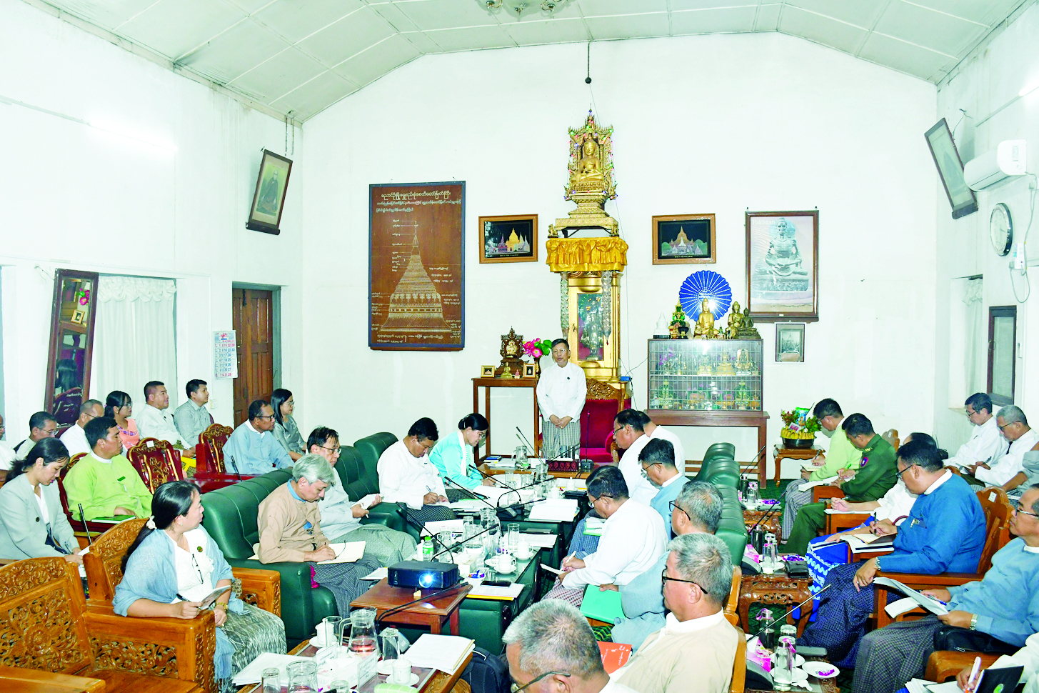 ဦးစွာ ပြည်ထောင်စုဝန်ကြီးက နိုင်ငံတော်အကြီးအကဲ၏ လမ်းညွှန်ချက်များနှင့်အညီ ရွှေစည်းခုံစေတီတော်ကြီး ပြုပြင်ထိန်းသိမ်းရေး ဆောင်ရွက်ရာတွင် ဘက်စုံလွှမ်းခြုံသောအစီအစဉ် ရေးဆွဲနိုင်ရေးအတွက် ယခုအစည်းအဝေးပြုလုပ်ရခြင်းဖြစ်ကြောင်း၊ ရွှေစည်းခုံစေတီတော်ကြီးတွင် ရှေးဟောင်းလက်ရာ ကျန်ရှိမှုအဆင့်သည် Grade 1 ဖြစ်ပြီး ကျန်စစ်သားမင်းကြီး အတ္ထုပ္ပတ္တိကျောက်စာတိုင်နှစ်တိုင်၊ ကမ္ဘာ့မှတ်တမ်းအမွေအနှစ်စာရင်းဝင်(Memory of the World–MoW) ဘုရင့်နောင်မင်းတရားကြီး၏ ဘာသာသုံးမျိုးဖြင့် ရေးထိုးထားသည့် ခေါင်းလောင်းကြီးလည်းရှိကြောင်း၊ လေးဘက်လေးတန်ရှိ ကြေးကူတိုက်များသည် သမိုင်းအရ အရေးပါသည့် နေရာများဖြစ်ကြောင်း၊ ဘုရားရင်ပြင်တော်ကိုလည်း ကမ္ဘာ့အမွေအနှစ်ဒေသတစ်ခုနှင့်အညီ ဆီလျော်တင့်တယ်မှုရှိအောင် ဆောင်ရွက်ရန်လိုအပ်သည်ကို တွေ့ရှိရကြောင်း။