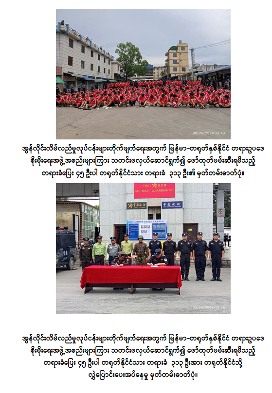အဆိုပါဖမ်းဆီးရမိသော တရုတ်နိုင်ငံသား တရားခံပြေး ၄၅ ဦးပါ တရုတ်နိုင်ငံသား စုစုပေါင်း ၃၁၃ ဦးတို့အား မြန်မာနိုင်ငံ၏တည်ဆဲဥပဒေများနှင့်အညီ အမှုဖွင့်အရေးယူထားပြီး ၎င်းတို့အား တရုတ်နိုင်ငံအနေဖြင့် ဆက်လက်အရေးယူဆောင်ရွက်နိုင်ရေးအတွက် လုံလောက်သော အစောင့်အရှောက်များဖြင့် ၂၀၂၄ ခုနှစ်၊ စက်တင်ဘာလ ၂၆ ရက်နေ့တွင် ယူနန်ပြည်နယ်၊ ရွှေလီမြို့ရှိ နယ်စပ်ဝင်/ထွက်ပေါက်မှတစ်ဆင့် လုပ်ထုံးလုပ်နည်းနှင့်အညီ ပြည်နှင်လွှဲပြောင်းပေးအပ်ခဲ့ပါသည်။