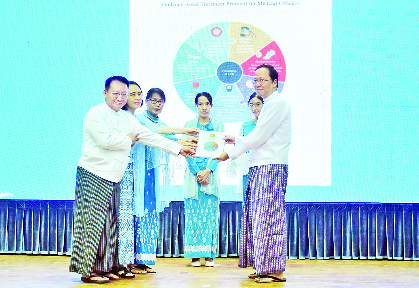ထို့နောက် (၂၀၂၄) ခုနှစ် ကမ္ဘာ့နှလုံးကျန်းမာရေးနေ့အထိမ်းအမှတ်ဗီဒီယိုပြသပြီး ပြည်သူ့ကျန်းမာရေးဦးစီးဌာန ညွှန်ကြားရေးမှူးချုပ်နှင့် နှလုံးသွေးကြောရောဂါကာကွယ်ထိန်းသိမ်းရေး စီမံချက်နှင့် ဆီးချိုသွေးချိုထိန်းသိမ်းရေးစီမံချက်တို့မှ စီမံချက်မန်နေဂျာများက နှလုံးနှင့်နှလုံးသွေးကြောရောဂါ ကာကွယ်ကုသမှုဆိုင်ရာ ဆရာဝန်များအတွက် လက်စွဲစာအုပ်ကိုပေးအပ်ရာ ပြည်ထောင်စုဝန်ကြီးက လက်ခံရယူသည်။