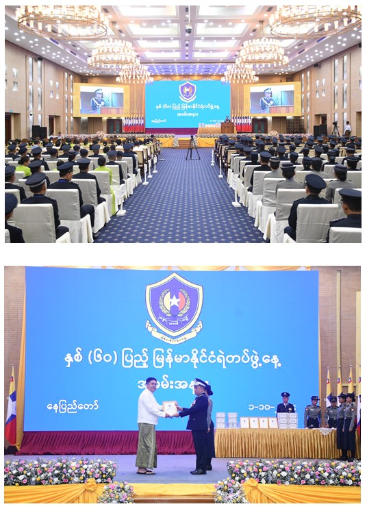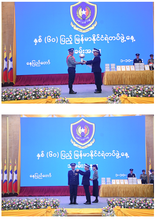 နှစ်(၆၀)ပြည့် မြန်မာနိုင်ငံရဲတပ်ဖွဲ့နေ့အခမ်းအနားကို ယနေ့နံနက်ပိုင်းတွင် နေပြည်တော်ရှိ မြန်မာအပြည်ပြည်ဆိုင်ရာကွန်ဗင်းရှင်းဗဟိုဌာန-၂ (MICC-2)၌ ကျင်းပခဲ့ရာ ပြည်ထဲရေးဝန်ကြီးဌာန၊ မြန်မာနိုင်ငံရဲတပ်ဖွဲ့ရဲချုပ် ဒုတိယရဲဗိုလ်ချုပ်ကြီးဝင်းဇော်မိုး တက်ရောက်မိန့်ခွန်းပြောကြားခဲ့သည်။