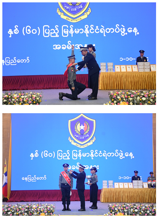 အခမ်းအနားတွင် မြန်မာနိုင်ငံရဲတပ်ဖွဲ့ရဲချုပ် ဒုတိယရဲဗိုလ်ချုပ်ကြီးဝင်းဇော်မိုးက မိန့်ခွန်းပြောကြားပြီး စံပြရဲအဆင့်တိုးဆုရရှိသူ အရာရှိ(၂)ဦး၊ အခြားအဆင့်(၃)ဦးနှင့် စွမ်းရည်သတ္တိအတွက် ရာထူးအဆင့်တိုးဆုရရှိသူ အရာရှိ(၃)ဦး၊ စွမ်းဆောင်မှုအတွက် ရာထူးအဆင့်တိုးဆုရရှိသူအရာရှိ(၂)ဦးတို့အား ဂုဏ်ပြုဆုတံဆိပ်များပေးအပ်ချီးမြှင့်ခဲ့ပြီး အနုပညာရှင်ကိုယ်စားလှယ်တစ်ဦးအား ဂုဏ်ပြုမှတ်တမ်းလွှာပေးအပ်ခဲ့သည်။