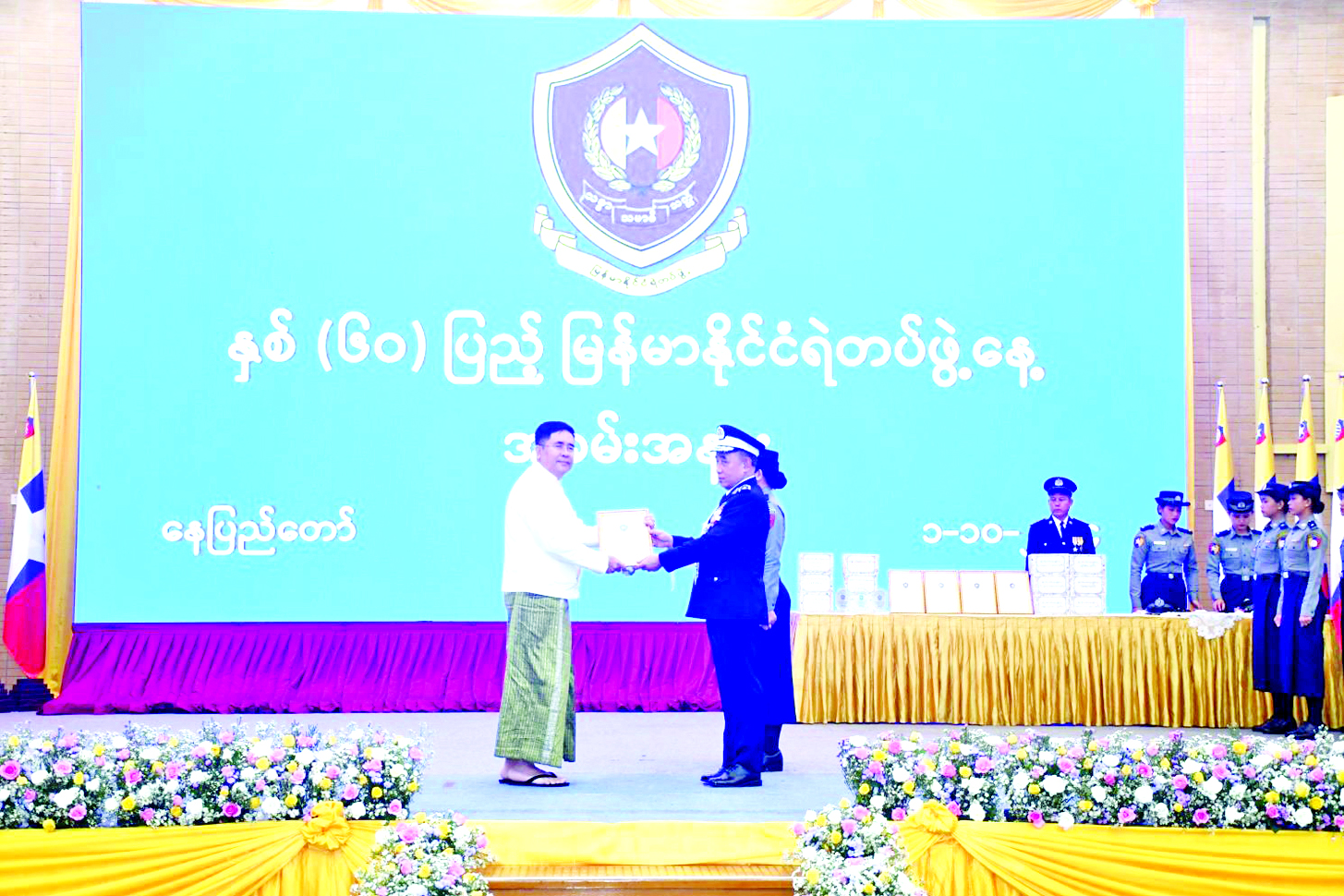 နှစ်(၆၀)ပြည့် မြန်မာနိုင်ငံရဲတပ်ဖွဲ့နေ့အခမ်းအနားကို ယနေ့နံနက်ပိုင်းတွင် နေပြည်တော်ရှိ မြန်မာအပြည်ပြည်ဆိုင်ရာကွန်ဗင်းရှင်းဗဟိုဌာန-၂ (MICC-2) ၌ ကျင်းပခဲ့ရာ ပြည်ထဲရေးဝန်ကြီးဌာန မြန်မာနိုင်ငံ ရဲတပ်ဖွဲ့ရဲချုပ် ဒုတိယရဲဗိုလ်ချုပ်ကြီးဝင်းဇော်မိုး တက်ရောက်မိန့်ခွန်းပြောကြားခဲ့သည်။