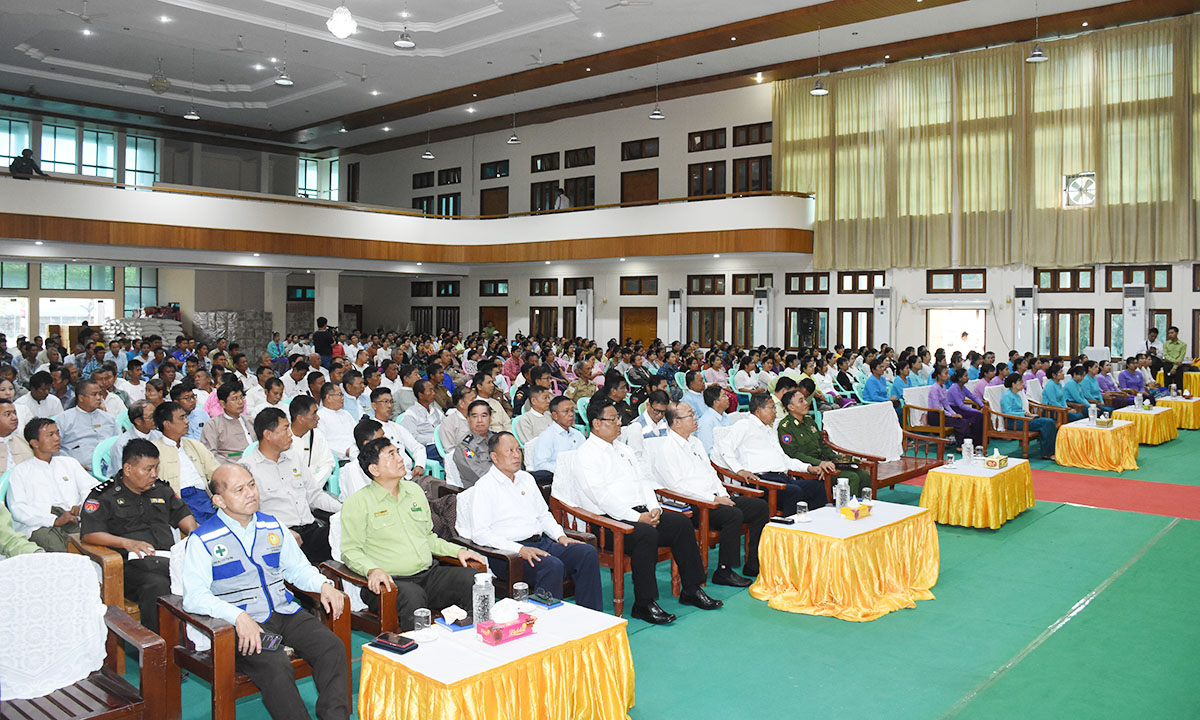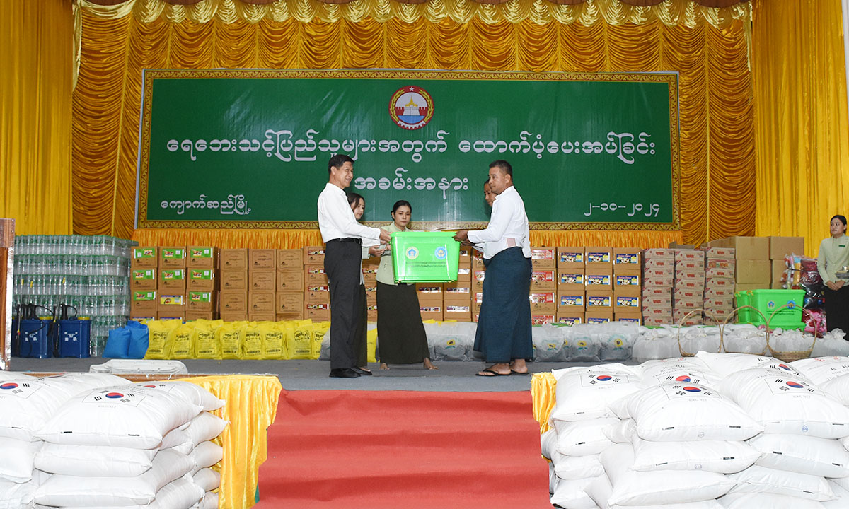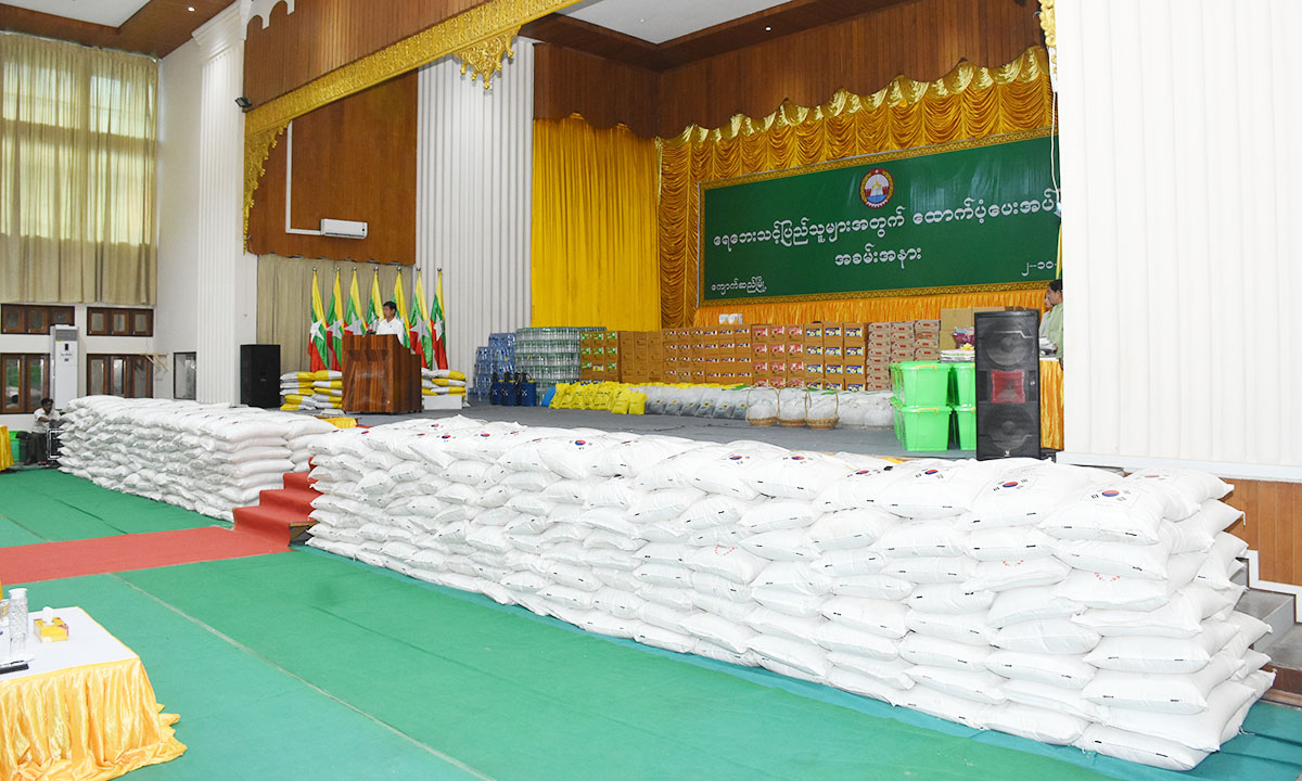 ယင်း အခမ်းအနားများ၌ တိုင်းဒေသကြီးဝန်ကြီးချုပ်၊ တိုင်းဒေသကြီးအစိုးရအဖွဲ့ဝင်ဝန်ကြီးများ၊ တိုင်းဒေသကြီးအမျိုးသမီးရေးရာအဖွဲ့နှင့် တိုင်းဒေသကြီးမိခင်နှင့်ကလေးစောင့်ရှောက်ကြီးကြပ်မှုအဖွဲ့တို့၏ နာယကနှင့်အဖွဲ့ဝင်များက အမျိုးသား သဘာဝဘေးအန္တရာယ်စီမံခန့်ခွဲမှုကော်မတီက ထောက်ပံ့ပေးအပ် သည့် စည်သွတ်ဘူးနှင့် ခေါက်ဆွဲခြောက်များ၊ ကယ်ဆယ်ရေးပစ္စည်းများ၊ ရေဘေးသင့်၍ သေဆုံးသွားသူများအား ထောက်ပံ့ငွေများ၊ နိုင်ငံသားစိစစ်ရေးကတ်ပြား မိတ္ထူများနှင့်ပုံစံ (၆၆/၆)မိတ္ထူများ၊ မျိုးစေ့များ၊ သဘာဝမြေဩဇာများ၊ စိုက်ပျိုးရေးသုံးဆေးဖျန်းပုံး များ၊သဘာဝရွက်ဖျန်းဓာတ်မြေဩဇာများ၊ ငါးသားပေါက်များ၊ တိုင်းဒေသကြီး အစိုးရအဖွဲ့နှင့်စေတနာရှင်အလှူရှင်များက ထောက်ပံ့လှူဒါန်းသည့် စားသောက်ကုန်ပစ္စည်းများ၊ ရေသန့်ဘူးများ၊ အဝတ်အထည်များအား ရေဘေးသင့်သူများနှင့် တာဝန်ရှိသူများထံပေးအပ်ပြီး ရေဘေးသင့်သူများကို လိုက်လံနှုတ်ဆက်အားပေးစကားများ ပြောကြားခဲ့သည်။