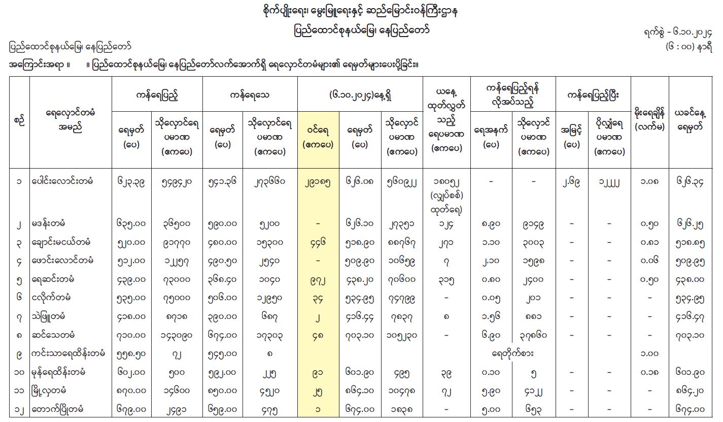 စိုက်ပျိုးရေး၊ မွေးမြူရေးနှင့်ဆည်မြောင်းဝန်ကြီးဌာန ဆည်မြောင်းနှင့် ရေအသုံးချမှုစီမံခန့်ခွဲရေးဦးစီးဌာနက ပြည်ထောင်စုနယ်မြေ နေပြည်တော်တွင် ထိန်းသိမ်းထားသော ရေလှောင်တမံနှင့် ရေထိန်းတမံစုစုပေါင်း (၁၂) ခုရှိရာ ယနေ့၌ ပေါင်းလောင်းရေလှောင်တမံတွင် (၂ ဒသမ ၆၅) ပေ ကန်ရေပြည့်အမှတ်အထက်ကျော်လွန်၍ ရေပိုလွှဲမှ ရေကျော်စီးဆင်းနေပြီး ယခင်နေ့နှင့် နှိုင်းယှဉ်ပါက ရေကျော်စီးဆင်းမှုအခြေအနေမှာ (၀ ဒသမ ၃၀) ပေ လျော့နည်းခြင်းဖြစ်သည်။