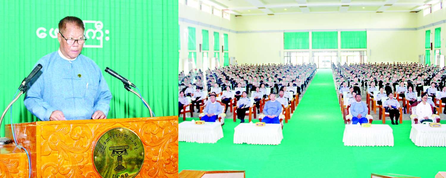 ဦးစွာ ပြည်ထောင်စုရာထူးဝန်အဖွဲ့ဥက္ကဋ္ဌက ပညာ၏အခြေခံဖြစ်သော စဉ်းစားတွေးခေါ်တတ်သူများဖြစ်လာအောင် သင်ကြားရေးသည် ဆရာဆရာမများ၏ တာဝန်ဖြစ်ကြောင်း၊ စေတနာ၊ အနစ်နာ၊ ဝါသနာအရင်းခံပြီး ကျောင်းသားလူငယ်များကို စာပေပညာတတ်ရုံသာမက နိုင်ငံချစ်စိတ်ရှိရေး၊ စိတ်ဓာတ်ကောင်းမွန်ရေး၊ ကာယ၊ ဉာဏ အကျင့်စာရိတ္တ ခိုင်မာကောင်းမွန်စေရေး ဆုံးမသွန်သင်ကြရန်နှင့် တစ်မျိုးသားလုံး ပညာရည်မြင့်မားရေးအတွက် ကျရာကဏ္ဍမှ အားသွန်ခွန်စိုက်ထမ်းဆောင်ကြရန် တိုက်တွန်းမှာကြားသည်။