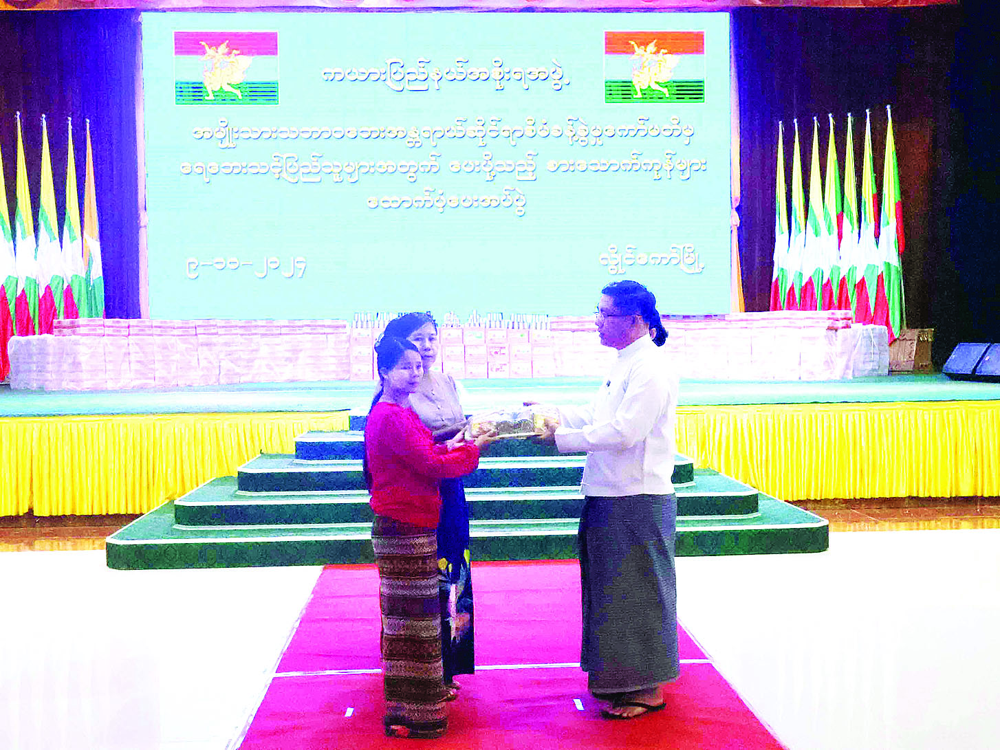 ထို့နောက် ပြည်နယ်ဝန်ကြီးချုပ်နှင့် ပြည်နယ်အစိုးရအဖွဲ့ဝင်များက အမျိုးသားသဘာဝဘေးအန္တရာယ်ဆိုင်ရာ စီမံခန့်ခွဲမှုကော်မတီက ထောက်ပံ့သည့် စည်သွတ်ဘူးနှင့် ခေါက်ဆွဲခြောက်များကို ထောက်ပံ့ပေးအပ်ကြရာ ယာယီရေဘေးသင့်ကယ်ဆယ်ရေးစခန်းများနှင့် ရေဘေးသင့်ရပ်ကွက်များမှ ကိုယ်စားလှယ်အသီးသီးက လက်ခံရယူကြသည်။