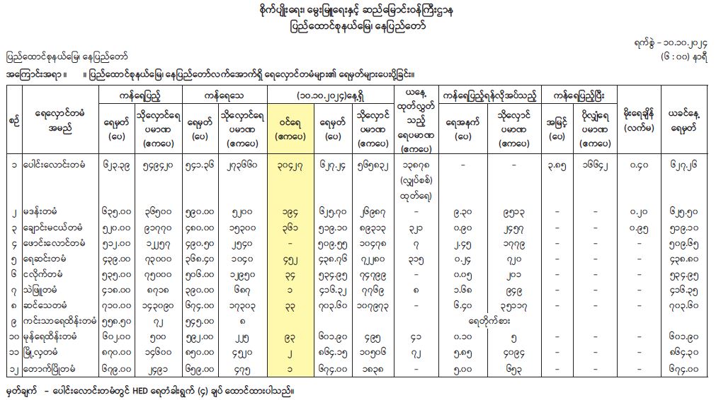 စိုက်ပျိုးရေး၊ မွေးမြူရေးနှင့် ဆည်မြောင်းဝန်ကြီးဌာန ဆည်မြောင်းနှင့် ရေအသုံးချမှုစီမံခန့်ခွဲရေးဦးစီးဌာနက ပြည်ထောင်စုနယ်မြေ နေပြည်တော်တွင် ထိန်းသိမ်းထားသော ရေလှောင်တမံနှင့် ရေထိန်းတမံစုစုပေါင်း (၁၂) ခုရှိရာ ယနေ့၌ ပေါင်းလောင်းရေလှောင်တမံတွင် (၃ ဒသမ ၈၅) ပေ ကန်ရေပြည့်အမှတ်အထက် ကျော်လွန်၍ ရေပိုလွှဲမှ ရေကျော်စီးဆင်းနေပြီး ယခင်နေ့နှင့် နှိုင်းယှဉ်ပါက ရေကျော်စီးဆင်းမှုအခြေအနေမှာ ယခင်နေ့ထက် (၀ ဒသမ ၀၂) ပေ လျော့နည်းခြင်းဖြစ်သည်။ ရေပိုလွှဲ၏ ကန်ရေပြည့်ရေမှတ်အထက်တွင် HED ရေတံခါး (၄) ချပ် ထောင်ထားသည်။