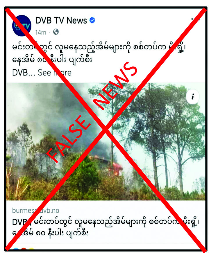 ချင်းပြည်နယ် မင်းတပ်မြို့တွင် လူမနေသည့် အိမ်များကို တပ်မတော်က မီးရှို့ဖျက်ဆီးနေခြင်းကြောင့် အိမ်ခြေ ၈၀ နီးပါးပျက်စီးခဲ့ကြောင်း သတင်းတု၊ သတင်းမှားများကို တရားမဝင်မီဒီယာများက လုပ်ကြံရေးသား ဝါဒဖြန့်ဝေလျက်ရှိသည်။