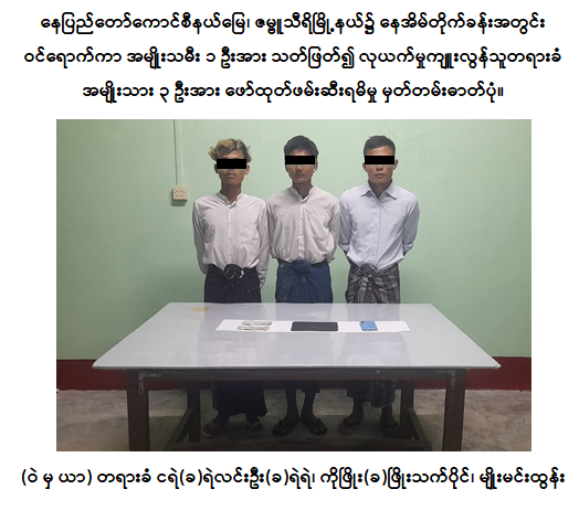 ဖြစ်စဉ်တွင် နေအိမ်အတွင်းဝင်ရောက်ကာ အမျိုးသမီးတစ်ဦးအား သတ်ဖြတ်လုယက်မှု ကျူးလွန်ခဲ့သူ ငရဲ (ခ) ရဲလင်းဦး (ခ) ရဲရဲ၊ မျိုးမင်းထွန်းနှင့် ကိုဖြိုး (ခ) ဖြိုးသက်ပိုင်တို့ ၃ ဦးအား လုံခြုံရေး တပ်ဖွဲ့ဝင်များက ဒုစရိုက်မှုကိုမလိုလားသည့် တာဝန်သိပြည်သူများ၏ ပူးပေါင်းကူညီမှုဖြင့် အချိန်တိုအတွင်း ဖော်ထုတ်ဖမ်းဆီးရမိခဲ့ပြီး တရားခံများအား ဥပဒေနှင့်အညီ အရေးယူနိုင်ရေးဆောင်ရွက်လျက်ရှိကြောင်းနှင့် အလားတူဒုစရိုက်မှုများ ကျူးလွန်နိုင်မှုမရှိစေရေး မိဘပြည်သူများအနေဖြင့် မိမိပတ်ဝန်းကျင်တွင် မသင်္ကာဖွယ်ရာ လှုပ်ရှားသွားလာဆောင်ရွက်မှုများ တွေ့ရှိရပါက နီးစပ်ရာလုံခြုံရေးတပ်ဖွဲ့ဝင်များထံ အသိပေးသတင်းပေးပို့တိုင်ကြားနိုင်ကြောင်းနှင့် ရပ်ရွာအေးချမ်းသာယာရေးနှင့် တရားဥပဒေစိုးမိုးရေးအတွက် လုံခြုံရေးတပ်ဖွဲ့ဝင်များက အချိန်နှင့်တစ်ပြေးညီ ဆက်လက်ဆောင်ရွက်လျက်ရှိကြောင်း သတင်းထုတ်ပြန်အပ်ပါသည်။