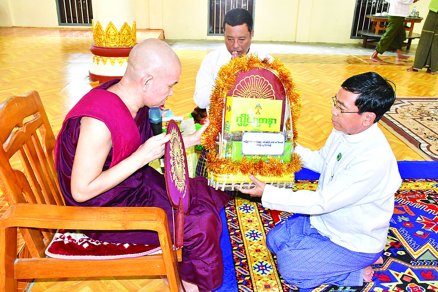 ဦးစွာ နေပြည်တော်ကောင်စီဥက္ကဋ္ဌနှင့်အဖွဲ့သည် နေပြည်တော်ပုဗ္ဗသီရိမြို့နယ်ရှိ သီရိမင်္ဂလာ ဥသျှစ်ကုန်းကျောင်းတိုက် ပဓာနနာယကဆရာတော် ဘဒ္ဒန္တဣန္ဒာစရိယနှင့် ကျည်တောင်ကန် (၂) ရပ်ကွက်အတွင်းရှိ မှန်ကျောင်းတိုက်ဘုန်းတော်ကြီးကျောင်း ပဓာနနာယကဆရာတော် ဘဒ္ဒန္တ ပရမတို့ကို သွားရောက်ဖူးမြော်ကြည်ညိုပြီး ကိုးပါးသီလခံယူဆောက်တည်ကာ ဆွမ်းဆန်တော်၊ ဆီ၊ လှူဖွယ်ဝတ္ထုပစ္စည်းများနှင့် နဝကမ္မအလှူတော်ငွေများ ဆက်ကပ်လှူဒါန်းသည်။