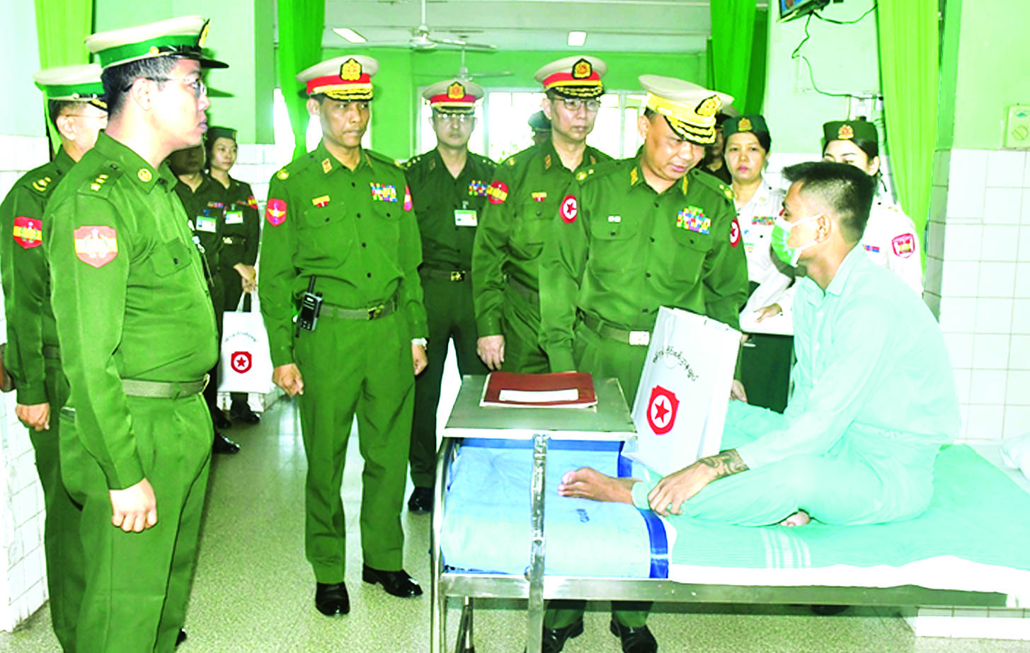 ကယားပြည်နယ် လွိုင်ကော်မြို့ရှိ တပ်မတော်ဆေးရုံ၊ ရန်ကုန်တိုင်းဒေသကြီး မင်္ဂလာဒုံမြို့နယ်ရှိ တပ်မတော်အရိုးရောဂါ အထူးကုဆေးရုံကြီး (ခုတင်-၅၀၀) နှင့် တပ်မတော်ဆေးရုံကြီး (ခုတင်-၁၀၀၀) တို့၌ တက်ရောက်ကုသမှုခံယူလျက်ရှိသော အရာရှိ၊ စစ်သည်၊ မိသားစုများ၊ မြန်မာနိုင်ငံရဲတပ်ဖွဲ့ဝင်များနှင့် ဒေသခံပြည်သူများအား ယနေ့တွင် သက်ဆိုင်ရာ တိုင်းစစ်ဌာနချုပ်များမှ တိုင်းမှူးများနှင့် တာဝန်ရှိသူများက သွားရောက်ကြည့်ရှု၍ တစ်ဦးချင်း၏ရောဂါဖြစ်ပွားမှု၊ ဆေးဝါးကုသပေးထားမှုနှင့် ကျန်းမာရေးတိုးတက်ကောင်းမွန်မှု အခြေအနေများကို ရင်းရင်းနှီးနှီး မေးမြန်းအားပေးစကားပြောကြားပြီး စားသောက်ဖွယ်ရာများပေးအပ်သည်။