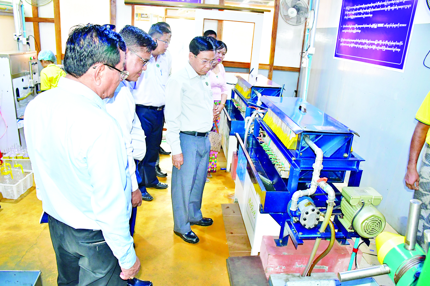 ထို့နောက် ဒက္ခိဏသီရိမြို့နယ် ဒက္ခိဏသီရိရပ်ကွက်အတွင်းရှိ အိလက်ရာအသင့်စားဖွယ် စားသောက်ကုန်အမျိုးမျိုး ထုတ်လုပ်ဖြန့်ချိရေးလုပ်ငန်းခွင်နှင့် ရွှေအင်ကြင်းရပ်ကွက်အတွင်းရှိ ဒေသထွက်ကုန်ကြမ်းမှ အဆင့်မြင့်စားသုံးဆီထုတ်လုပ်မှု လုပ်ငန်းဆောင်ရွက်နေသည့် လင်းစိန်ဆီစက်နှင့် ဆီထုပ်ပိုးမှုလုပ်ငန်းခွင်တို့သို့ ရောက်ရှိပြီး လုပ်ငန်းများဆောင်ရွက်နေမှုအခြေအနေကို လှည့်လည်ကြည့်ရှုစစ်ဆေးကာ ဒေသထွက်ကုန်ကြမ်းများကို အဆင့်မြင့်ထုတ်ကုန်များအဖြစ်ထုတ်လုပ်ပြီး ဒေသတွင်းသာမက ပြည်ပနိုင်ငံများသို့ တင်ပို့ရောင်းချနိုင်ရေးဆောင်ရွက်ကြရန်၊ နေပြည်တော်အတွင်း အလားတူလုပ်ငန်းများ တွင်ကျယ်စွာဆောင်ရွက်ရေး အားပေးဆောင်ရွက်ရန်၊ ပြည်ပသွင်းကုန် အစားထိုးလုပ်ငန်းများကို အလေးထားဆောင်ရွက်ရန် ဆွေးနွေးမှာကြားသည်။