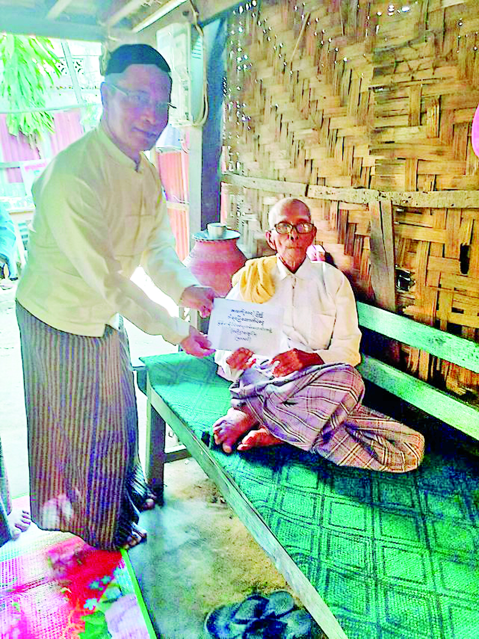မန္တလေးတိုင်းဒေသကြီး စစ်မှုထမ်းဟောင်းကြီးကြပ်ရေးအဖွဲ့ဥက္ကဋ္ဌနှင့် တာဝန်ရှိသူများသည် အောက်တိုဘာ ၁၆ ရက် နံနက်ပိုင်းက မဟာအောင်မြေမြို့နယ် စစ်မှုထမ်းဟောင်းအဖွဲ့ဝင်၊ စိန်ပန်းရပ်ကွက် ဂွမ်းရုံဈေးရပ်နေ မော်ကွန်းဝင် ဒုတိယအဆင့် တပ်သားချစ်မောင် (အငြိမ်းစား) အသက် ၁၀၀ အား ဂါရဝပြု သွားရောက်တွေ့ဆုံပြီး ထောက်ပံ့ငွေများ ပေးအပ်ကြသည်။