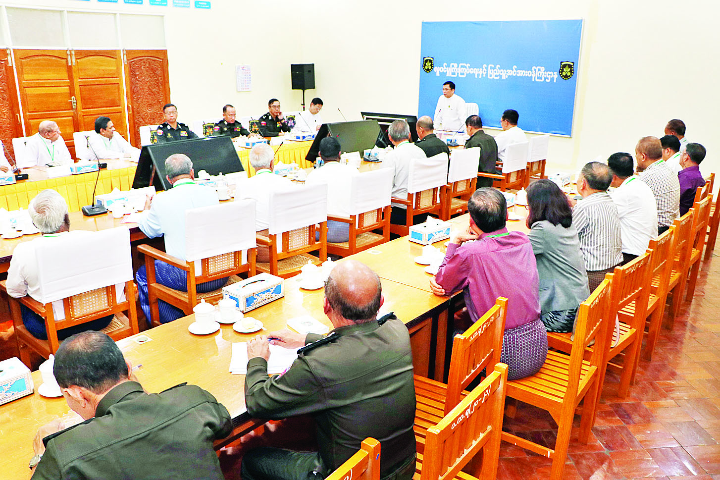 ဆွေးနွေးတင်ပြမှုများအပေါ် ဒုတိယဝန်ကြီး ဦးဌေးလှိုင်နှင့် ဒေါက်တာမျိုးသန့်၊ ဦးစီးဌာနများမှ ညွှန်ကြားရေးမှူးချုပ်များက လုပ်ငန်းကဏ္ဍအလိုက် ဥပဒေ၊ လုပ်ထုံးလုပ်နည်းများနှင့်အညီ တင်ပြဆောင်ရွက်နိုင်ရေးနှင့် ကြန့်ကြာမှုမရှိစေရေး ဆောင်ရွက်ပေးနိုင်မည့်အခြေအနေကို ပြန်လည်ရှင်းလင်းဖြေကြားကြပြီး ပြည်ထောင်စုဝန်ကြီးက လုပ်ငန်းများ အဆင်ပြေမြန်ဆန်ချောမွေ့စွာ ဆောင်ရွက်နိုင်ရေးအတွက် ပံ့ပိုးကူညီဆောင်ရွက်ပေးနိုင်ရေးနှင့်စပ်လျဉ်း၍ ရှင်းလင်းပြောကြားခဲ့ကြောင်း သိရသည်။