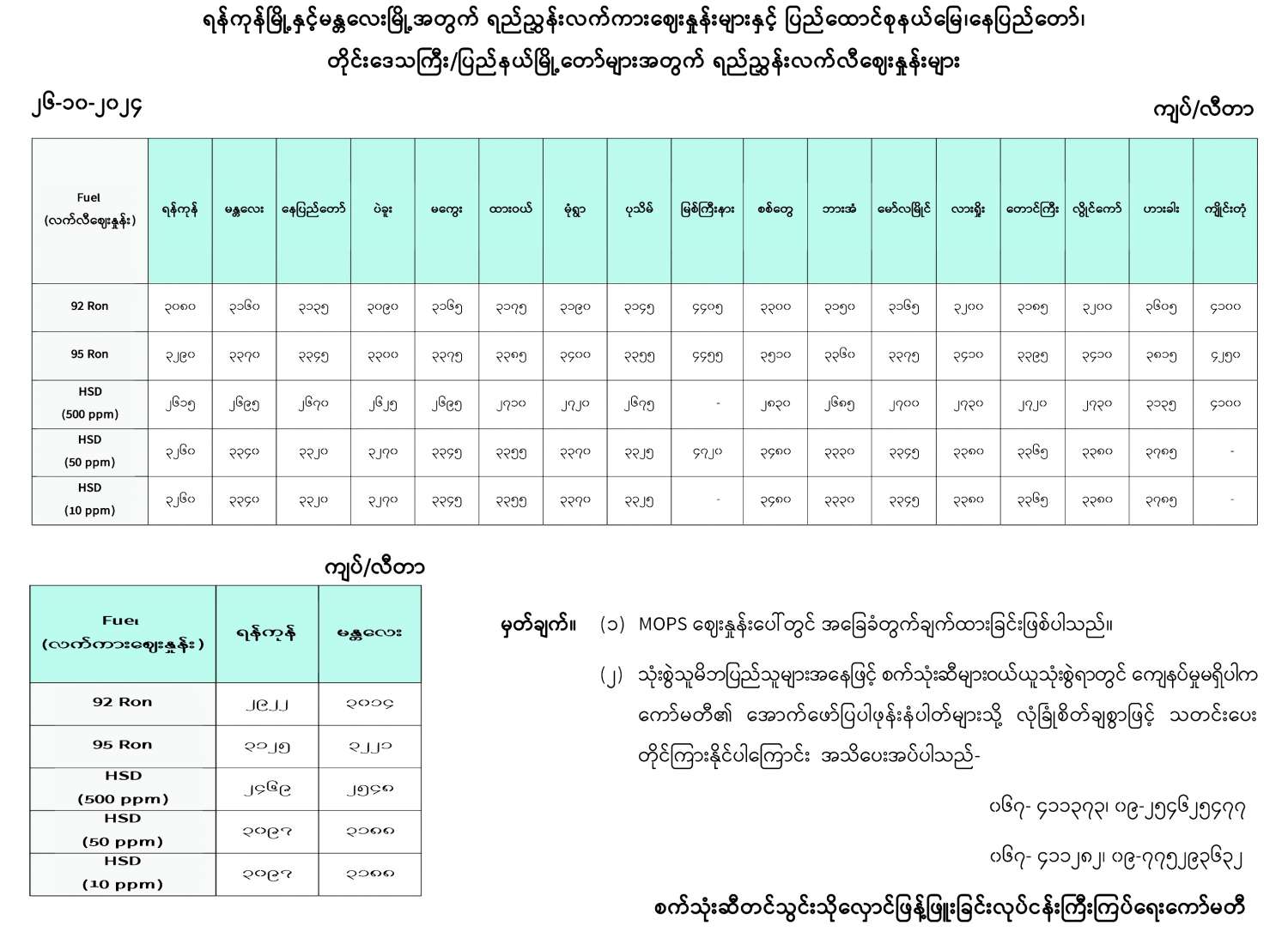 ရန်ကုန်မြို့နှင့် မန္တလေးမြို့အတွက် ရည်ညွှန်းလက်ကားဈေးနှုန်းများနှင့် ပြည်ထောင်စုနယ်မြေ နေပြည်တော်၊ တိုင်းဒေသကြီး/ပြည်နယ် မြို့တော်များအတွက် ရည်ညွှန်းလက်လီဈေးနှုန်းများ 10/26/2024