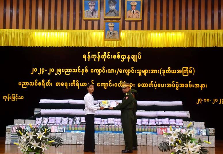 ၂၀၂၄-၂၀၂၅ ပညာသင်နှစ်တွင် တက်ရောက်ပညာသင်ကြားနေသည့် ရန်ကုန်တိုင်းစစ်ဌာနချုပ်နှင့် ကွပ်ကဲမှုအောက်တပ်နယ်၊ တပ်ရင်း/တပ်ဖွဲ့များမှ ကျောင်းသား၊ ကျောင်းသူများအတွက် (ဒုတိယအကြိမ်)ပညာသင်စရိတ်၊ စာရေးကိရိယာနှင့် ကျောင်းဝတ်စုံများပေးအပ်ပွဲကို ယနေ့နေ့လယ်ပိုင်းက ရန်ကုန်တိုင်းစစ်ဌာနချုပ်၊ အနော်ရထာခန်းမ၌ ကျင်းပပြုလုပ်ရာ တိုင်းမှူး ဗိုလ်ချုပ်ဇော်ဟိန်းနှင့် တာဝန်ရှိသူများ၊ အရာရှိ၊ စစ်သည်၊ မိသားစုဝင်များ၊ ကျောင်းသား၊ ကျောင်းသူများ တက်ရောက်ကြသည်။