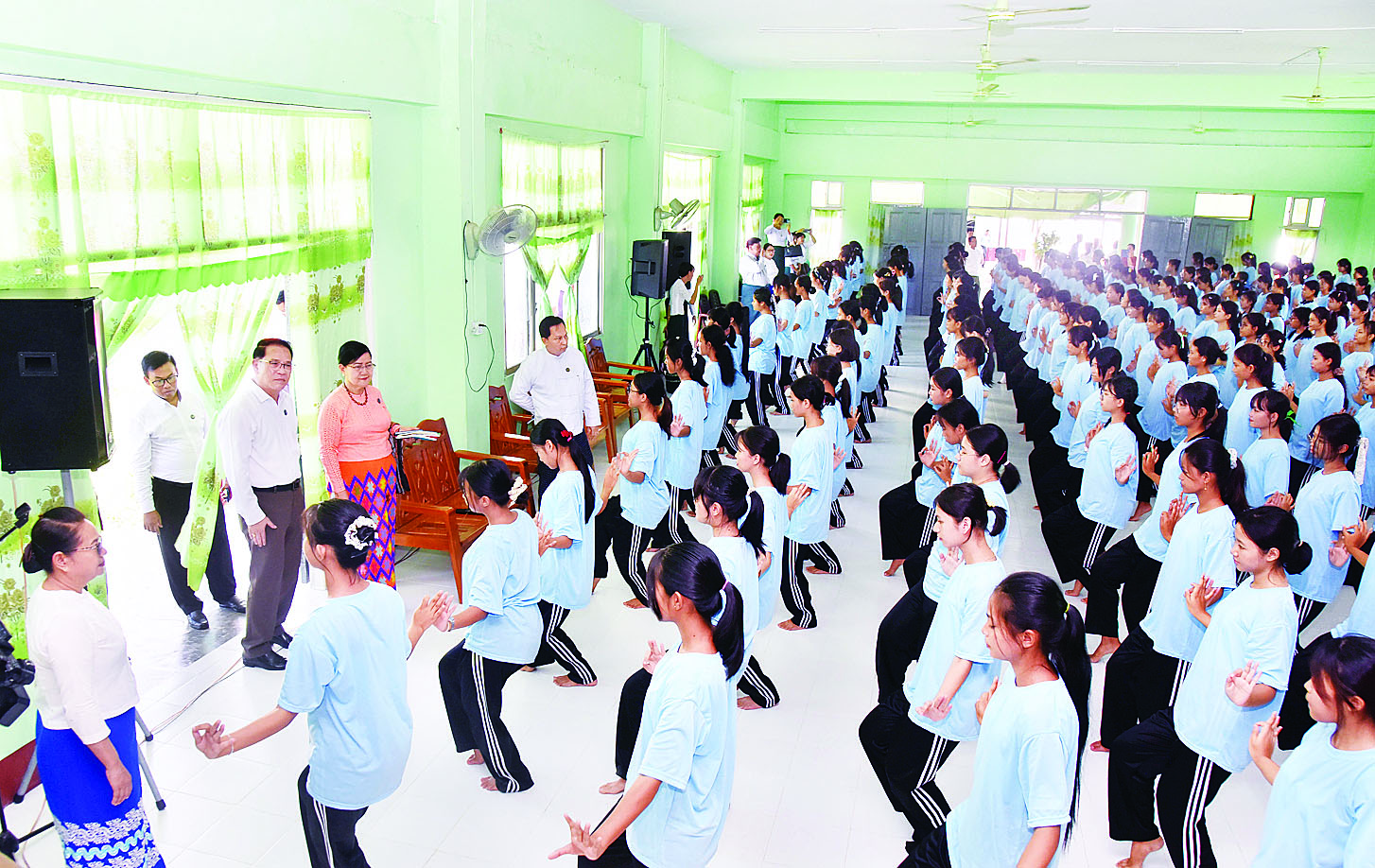 ဦးစွာ နေပြည်တော် ဇမ္ဗူသီရိမြို့နယ် ဝဏ္ဏသိဒ္ဓိရပ်ကွက်ရှိ အမှတ်(၁၁) အခြေခံပညာအထက်တန်းကျောင်းရှိ ပညာ့ဗိမာန်ခန်းမ၌ ပဉ္စမအကြိမ် အမျိုးသားအားကစားပွဲတော် ဖွင့်ပွဲ၊ ပိတ်ပွဲအခမ်းအနားတွင် အကအလှများဖြင့် ဖျော်ဖြေတင်ဆက်ကြမည့် ကျောင်းသူများနှင့် တွေ့ဆုံသည်။