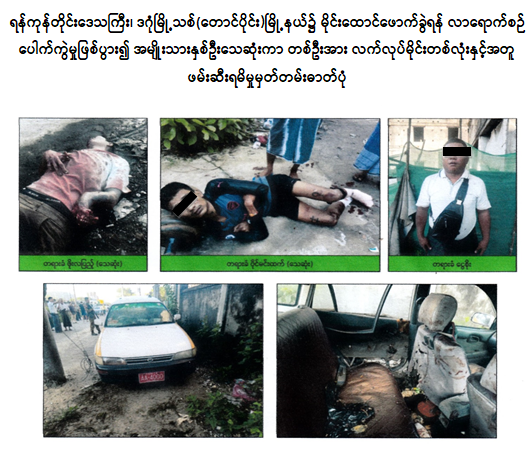 ထိုသို့စစ်ဆေးခဲ့ရာ ယင်းနေ့နံနက် ၄ နာရီခွဲတွင် ဖိုးလပြည့်၊ ပိုင်မင်းထက်နှင့် အောင်နိုင်ထွန်း (ခ) ကရင်တို့သည် ငွေစိုး (၄၀) နှစ်မောင်းနှင်သည့် Toyota Corolla အမျိုးအစား YGN AA-4000 နံပါတ်ပါအဖြူရောင်အငှားယာဉ်ဖြင့် အမှတ် (၉၄) ရပ်ကွက်အုပ်ချုပ်ရေးမှူးရုံးအား မိုင်းထောင်ဖောက်ခွဲရန်သွားရောက်စဉ် အဆိုပါရုံးအနီးအရောက်၌ ယာဉ်ပေါ်တွင်သယ်ဆောင်လာသည့် လက်လုပ်မိုင်းမှာပေါက်ကွဲခဲ့သဖြင့် ဖိုးလပြည့်နှင့် ပိုင်မင်းထက်တို့နှစ်ဦးတွင် မိုင်းပေါက်ကွဲစထိမှန် ဒဏ်ရာများရရှိခဲ့ပြီး အောင်နိုင်ထွန်း (ခ) ကရင်မှာ ယာဉ်ပေါ်မှ ဆင်းပြေးသွားခဲ့ကာ ယာဉ်မောင်းဖြစ်သူ ငွေစိုးမှ ဖိုးလပြည့်နှင့် ပိုင်မင်းထက်တို့နှစ်ဦးအား တင်ဆောင်၍ ဆက်လက်မောင်းနှင်ကာ အမှတ် (၃၀) အခြေခံပညာ မူလတန်းကျောင်းအနီး အရောက်၌ ယာဉ်ပေါ်မှချထားခဲ့ခြင်းဖြစ်ကြောင်း ဖော်ထုတ်သိရှိရသည်။