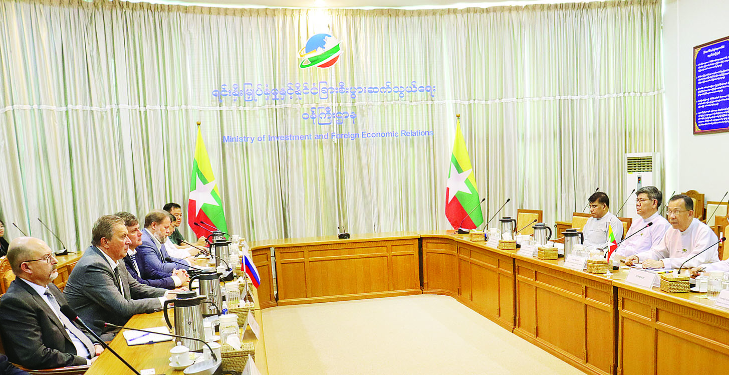 ရင်းနှီးမြှုပ်နှံမှုနှင့် နိုင်ငံခြားစီးပွားဆက်သွယ်ရေးဝန်ကြီးဌာန ပြည်ထောင်စုဝန်ကြီး ဒေါက်တာကံဇော်သည် ရုရှားဖက်ဒရေးရှင်းနိုင်ငံ ရုရှား-မြန်မာ စီးပွားရေးကောင်စီ (Russian - Myanmar Business Council-RMBC)ဥက္ကဋ္ဌ Mr. Aleksei SHUPLOV ဦးဆောင်သည့် ကိုယ်စားလှယ်အဖွဲ့အား ယနေ့မွန်းလွဲပိုင်းတွင် နေပြည်တော်ရှိ ရင်းနှီးမြှုပ်နှံမှုနှင့် နိုင်ငံခြားစီးပွားဆက်သွယ်ရေးဝန်ကြီးဌာန ရုံးအမှတ် (၁)၌ လက်ခံတွေ့ဆုံသည်။