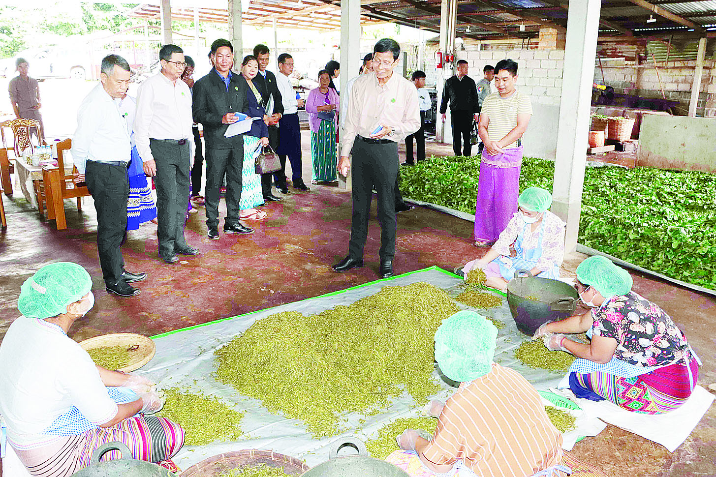 ထို့နောက် အသေးစားစက်မှုလက်မှုလုပ်ငန်းဦးစီးဌာန၏ တန်ဖိုးမြင့်ထုတ်ကုန်နည်းပညာများ ပံ့ပိုးပေးထားသော ထူးမြတ်သဘာဝဒေသထွက်ကုန် လက်ဖက်စိုရောင်းဝယ်ရေးလုပ်ငန်းနှင့် ရွှေရွက်စိမ်းလက်ဖက်စို၊ လက်ဖက်ခြောက်ပွဲရုံတို့ကို ကြည့်ရှုစစ်ဆေးသည်။ အဆိုပါ လုပ်ငန်းရှင်များအတွက် လုပ်ငန်းသုံးပစ္စည်းများဖြစ်သော လက်ဖက်စိုလှိမ့်စက်နှင့် အိတ်ပိတ်စက်များကို အသေးစားကုန်ထုတ် လုပ်ငန်းများဖန်တီးပေးနိုင်ရေးနှင့် ကျေးလက်နေ မိသားစုဝင်ငွေတိုးရေးစီမံကိန်းဖြင့် သမဝါယမနှင့် ကျေးလက်ဖွံ့ဖြိုးရေးဝန်ကြီးဌာနက ကူညီပံ့ပိုးပေး ထားခြင်းဖြစ်ကြောင်း သိရသည်။