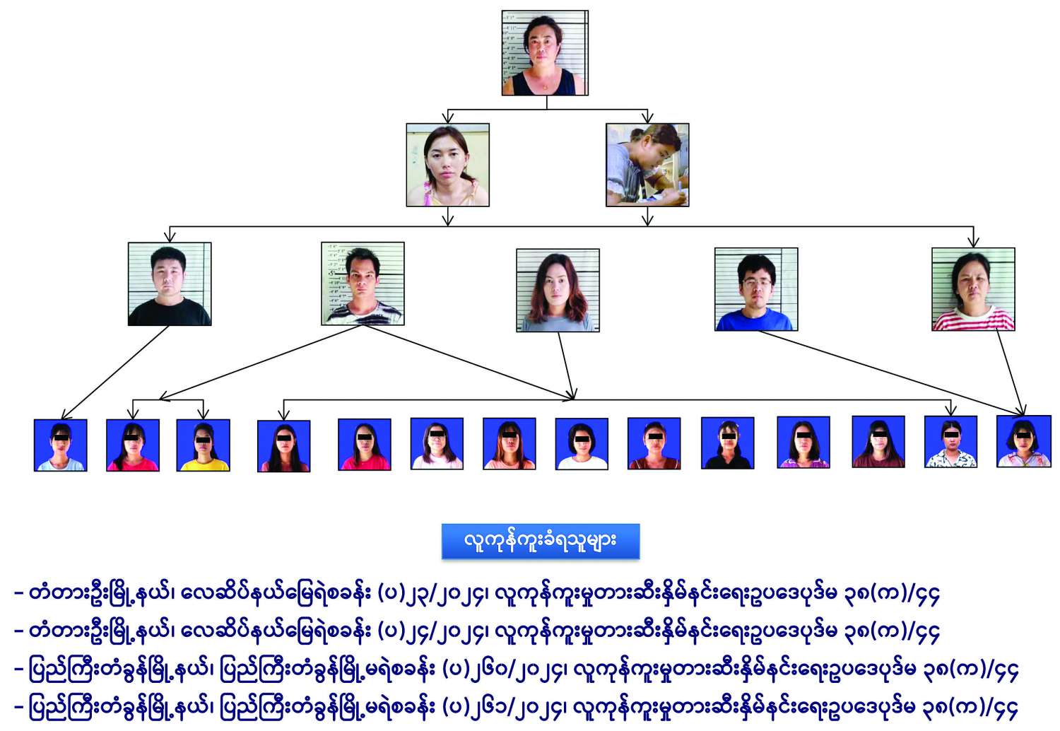 ထို့ကြောင့် မန္တလေးမြို့၌အခြေချ၍ လူကုန်ကူးမှုဂိုဏ်းဖွဲ့ကျူးလွန်ခဲ့သူ ဒေါ်နန်းဆိုင်ခမ်း (ခ) မားမား (ဖမ်းဆီးရမိ)၊ မမေထက်နိုင်ဦး (ခ) မထက် (တိမ်းရှောင်)၊ မဇင်သူခိုင် (တိမ်းရှောင်)၊ ချစ်ထူး (ဖမ်းဆီးရမိ)၊ မဖြိုးဖြိုးဝေ (ဖမ်းဆီးရမိ)၊ တရုတ်နိုင်ငံသား GAO FENGYING (ကောင်းဖိန်းရင်) (ဖမ်းဆီးရမိ)၊ တရုတ်နိုင်ငံသား LIN JIAN နှင့် ၎င်း၏မိခင်ဖြစ်သူ LI MANFEN (ဖမ်းဆီးရမိ)တို့ ရှစ်ဦးအား သက်ဆိုင်ရာ ရဲစခန်းများဖြစ်သည့် တံတားဦးမြို့နယ် လေဆိပ်နယ်မြေရဲစခန်း (ပ) ၂၃/၂၀၂၄၊ လူကုန်ကူးမှုတားဆီးနှိမ်နင်းရေး ဥပဒေပုဒ်မ ၃၈ (က)/၄၄ ဖြင့်လည်းကောင်း၊ တံတားဦး မြို့နယ်လေဆိပ်နယ်မြေရဲစခန်း (ပ) ၂၄/၂၀၂၄၊ လူကုန်ကူးမှုတားဆီးနှိမ်နင်းရေးဥပဒေပုဒ်မ ၃၈(က)/၄၄ ဖြင့်လည်းကောင်း၊ ပြည်ကြီးတံခွန်မြို့မရဲစခန်း (ပ) ၂၆၀/၂၀၂၄၊ လူကုန်ကူးမှုတားဆီး နှိမ်နင်းရေး ဥပဒေပုဒ်မ ၃၈(က)/၄၄ ဖြင့်လည်းကောင်း၊ ပြည်ကြီးတံခွန်မြို့မရဲစခန်း (ပ) ၂၆၁/၂၀၂၄၊ လူကုန်ကူးမှုတားဆီးနှိမ်နင်းရေးဥပဒေပုဒ်မ ၃၈(က)/ ၄၄ ဖြင့်လည်းကောင်း အမှုဖွင့်အရေးယူ ထားရှိကြောင်း သိရသည်။